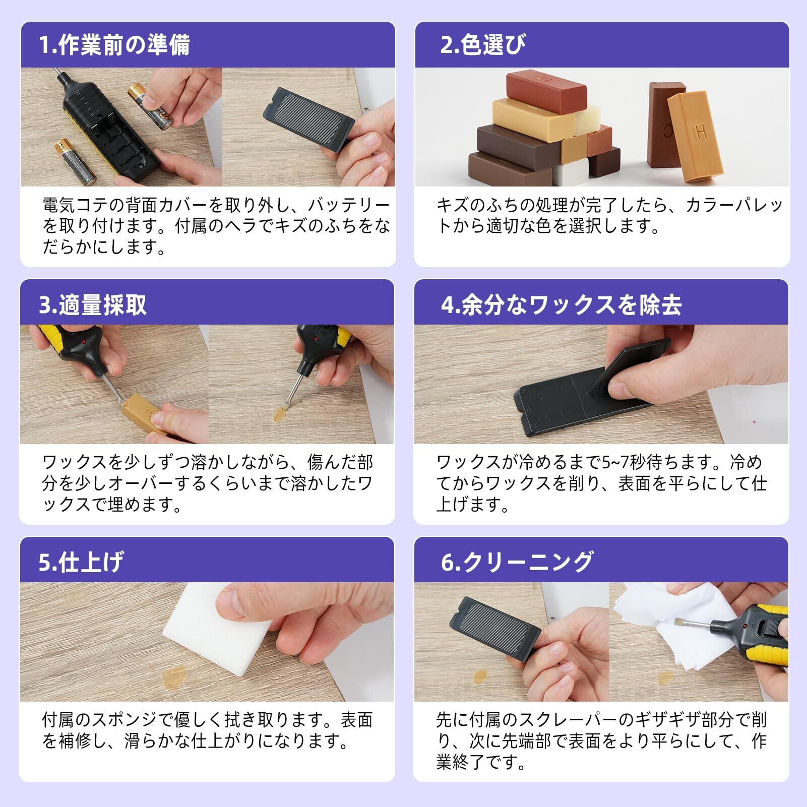 【新規アップグレード】木製の製品修理ワックス、アップグレードされた電気コテツール*1、ハードワックスフィラー*11、クリーニングスクレーパー*1、研磨スポンジ*1、テクスチャースクレーパー*1、クリーニングクロス(ホワイト)*1付きます。