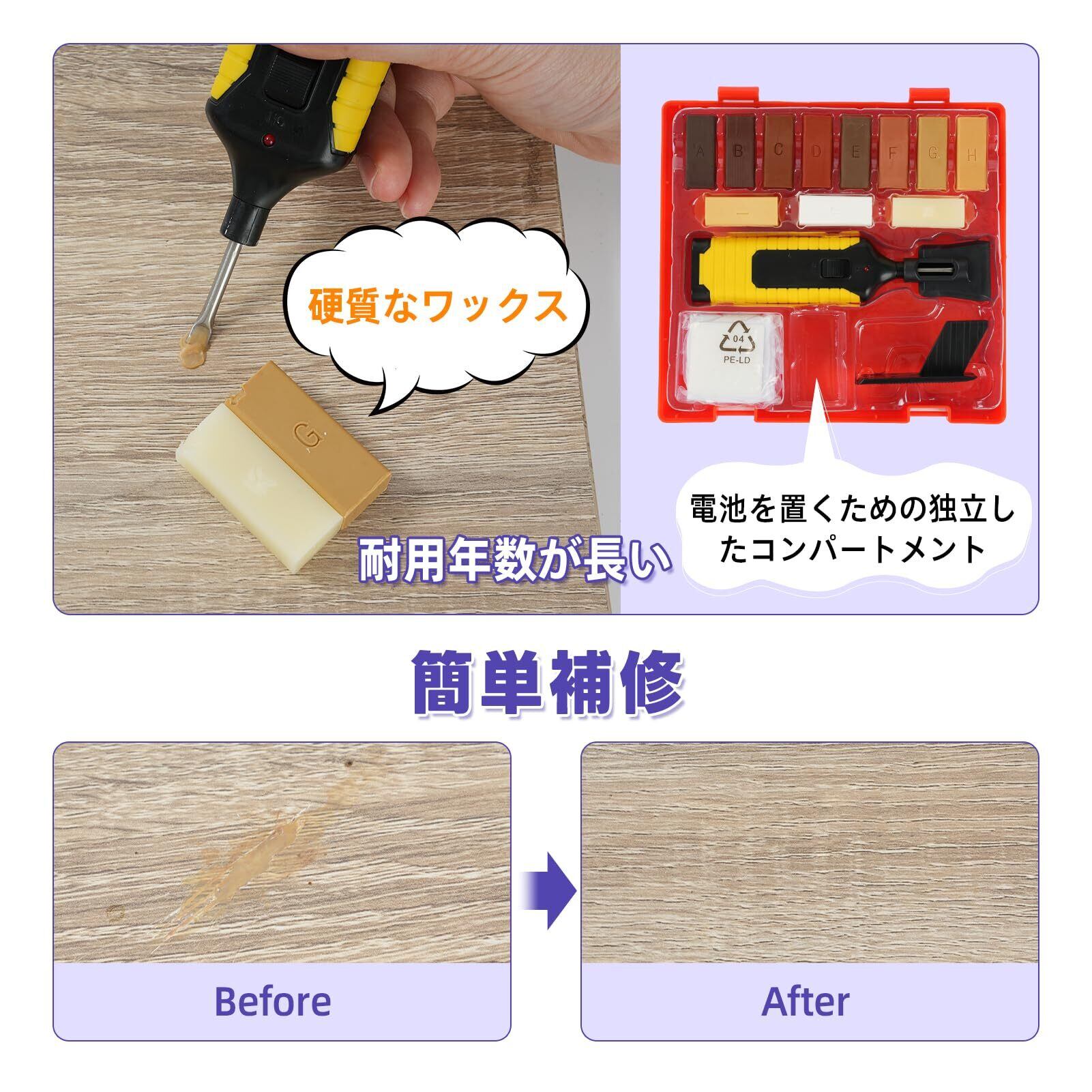 【幅広い用途】DIY手作り床家具補修キットは、床、ワークトップ、家具、キャビネット、木材、窓枠などについた傷やペットの傷を補修し、穴やひび割れ、へこみ、破損を埋め、キズのついた家具を元の外観に戻します。君の家具を真新しく蘇らせます。ウッドワックスパッチセットは、安全で無害な高品質の樹脂材料で作られています。
