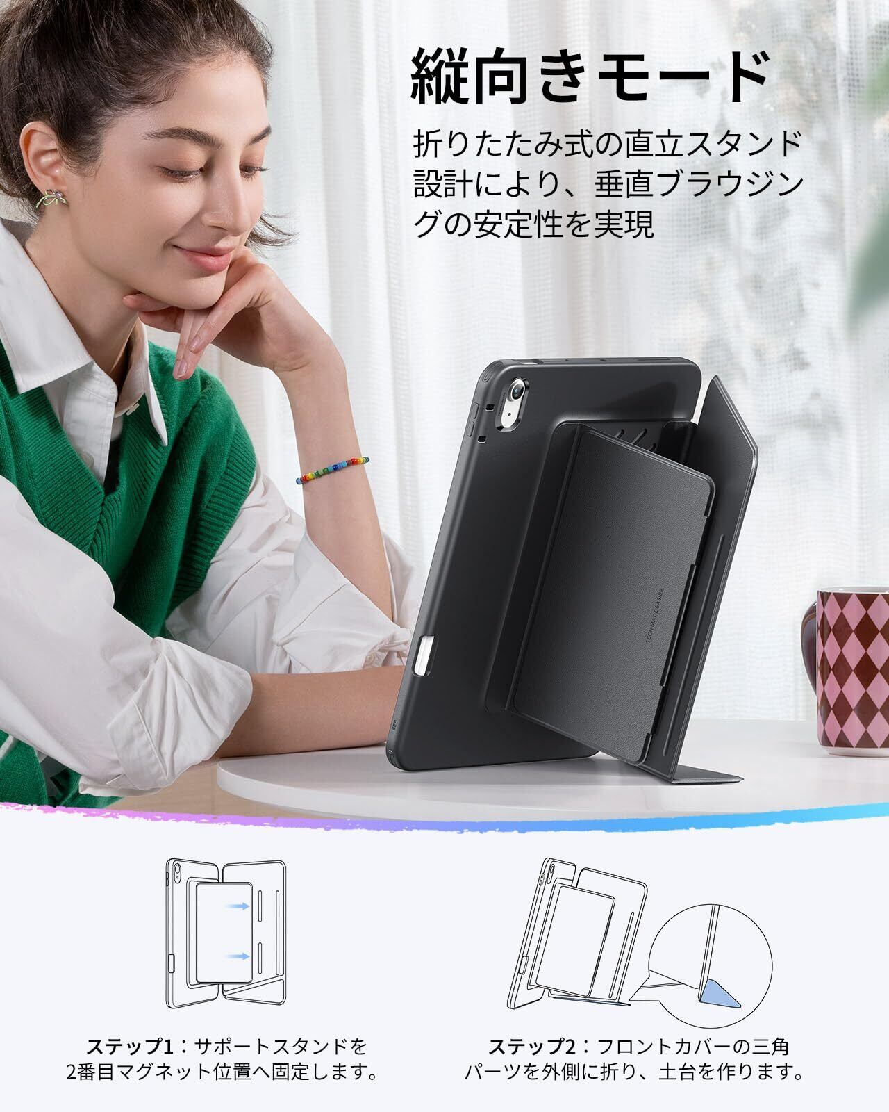 【縦横自在スタンド機能】:3段階調節可能な横向きモードと、独自開発の「三角ダブルロック構造」を採用した縦向きモードを備えています。動画視聴からSNS閲覧まで、磁石スタンドサポートによる固定デザインにより、確かな安定性を実現します。縦向き利用時は2番目のマグネット位置へ固定し、フロントカバーの小さな三角パーツを外側に折ることでしっかりと自立します(内側に広げて使用しないでください)。