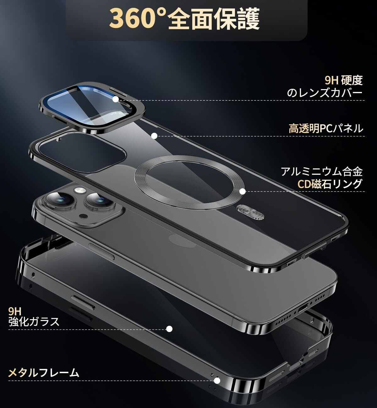 【カメラレンズ保護・スタンド一体】NIANGUO iPhone13 mini 用 ケース MagSafe対応 クリア 両面 【ロック付き・アクションボタン】 隠しカメラスタンド アイホン13ミニケース 9H強化ガラス メタルフレーム ストラップホール付き 画面感度良い ワイヤレス充電対応 アイフォン13 mini 用 ケース 5.4インチ(ブラック)