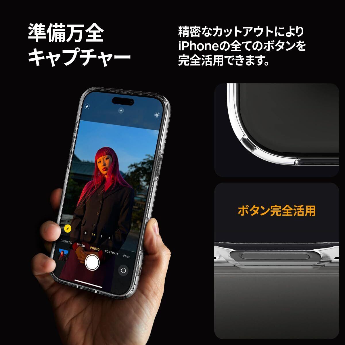 【高耐久のクリア素材】装脱着が簡単になる柔らかいTPU(熱可塑性ポリウレタン)に丈夫なPC(ポリカーボネート)をハイブリッドさせた2重構造でデバイスを守ります。背面のPCにはUVコーティング、側面のTPUには青いレジンを活用した新素材「デュラクリア」を使い、黄変を最小限に抑制しました。