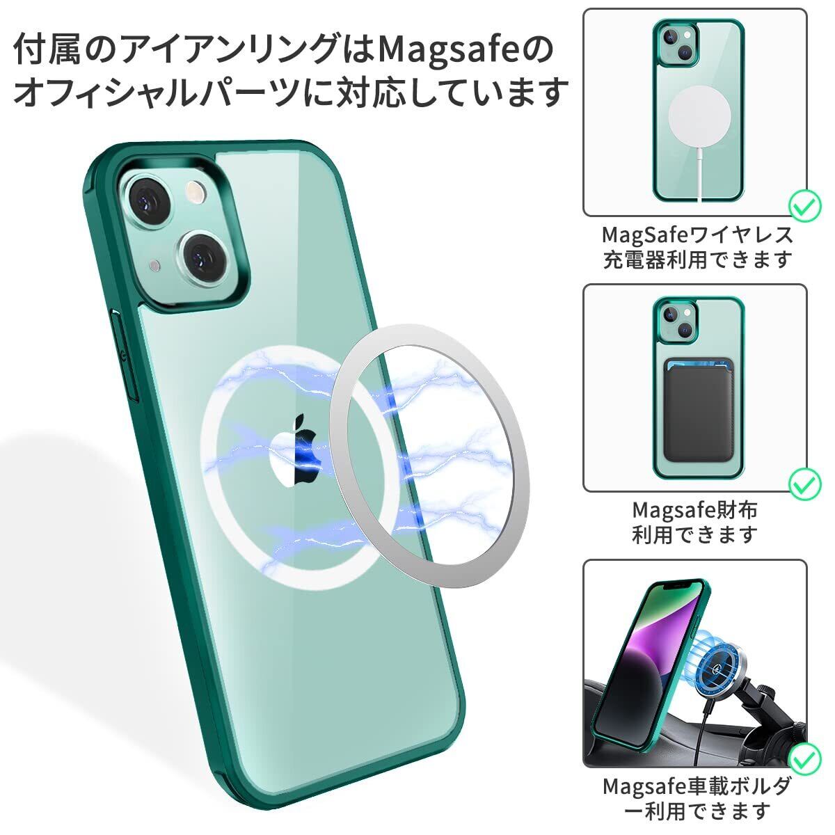 【MagSafeアクセサリを利用できる鉄リングを贈ります】附属の鉄リングはiPhone 15 Magsafeケースの後側に固定して、15倍の強力な磁気吸引力を得ることができます。MagSafe対応充電器および各種アクセサリが利用できます。iPhone 15 Magsafeケースは自動的にMagsafeワイヤレス充電器と合わせ、360度回転することができます。簡単に落ちることはできません。ワイヤレス充電の時、iPhone 15 Magsafeケースを取り外す必要はありません。