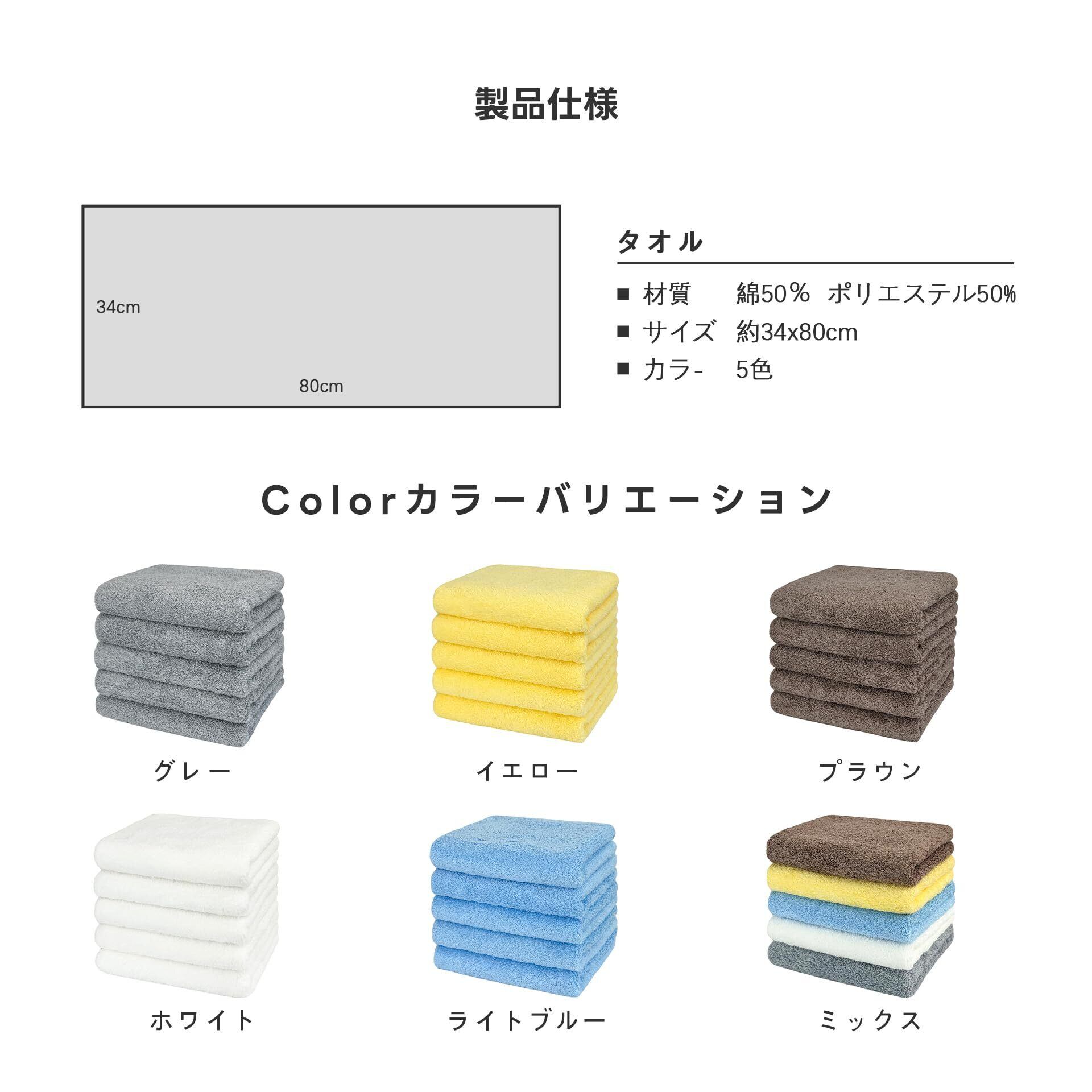 1.タオル 5枚セット:家族みんなでオールシーズン使えます! サイズ:34×80cm 素材:綿50% ポリエステル50% 重量:約125g 特徴:吸水・速乾・絞りやすい・蛍光染料なし。パッケージ:紙製の箱に入ります。