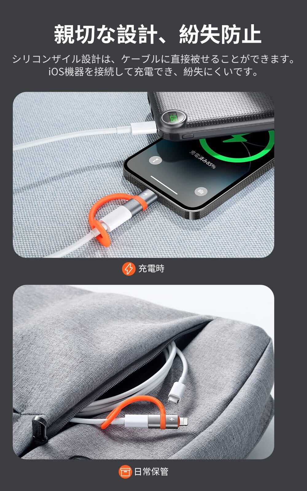 【高品質な素材】:アルミ合金素材を採用して、高速に放熱可能ですし、性能が安定しています。精密なコネクタにより、スムーズに抜き差すことが可能です。インターフェースは平らで、ぴったりとフィットし、緩みません。【親切な設計、紛失防止】:シリコンザイル設計は、ケーブルに直接被せることができます。iOS機器を接続して充電でき、紛失にくいです。