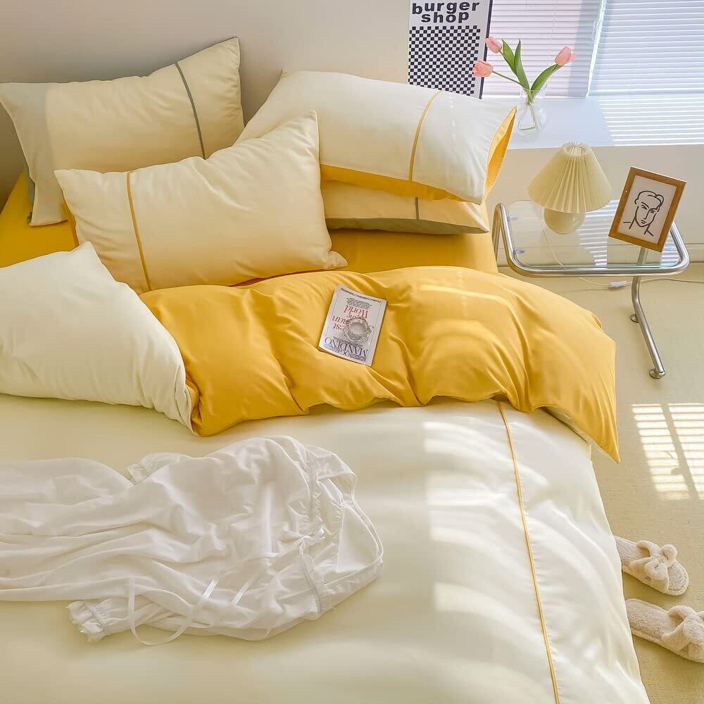 Ovege 布団カバー 3点セット シングル 掛け布団カバー ボックスシーツ 枕カバー 洋式・和式兼用 2方向ジッパー 100%マイクロファイバー ピーチスキン加工 洗い替え速乾タイプ (イェロー-クリーム, シングル・3点セット)