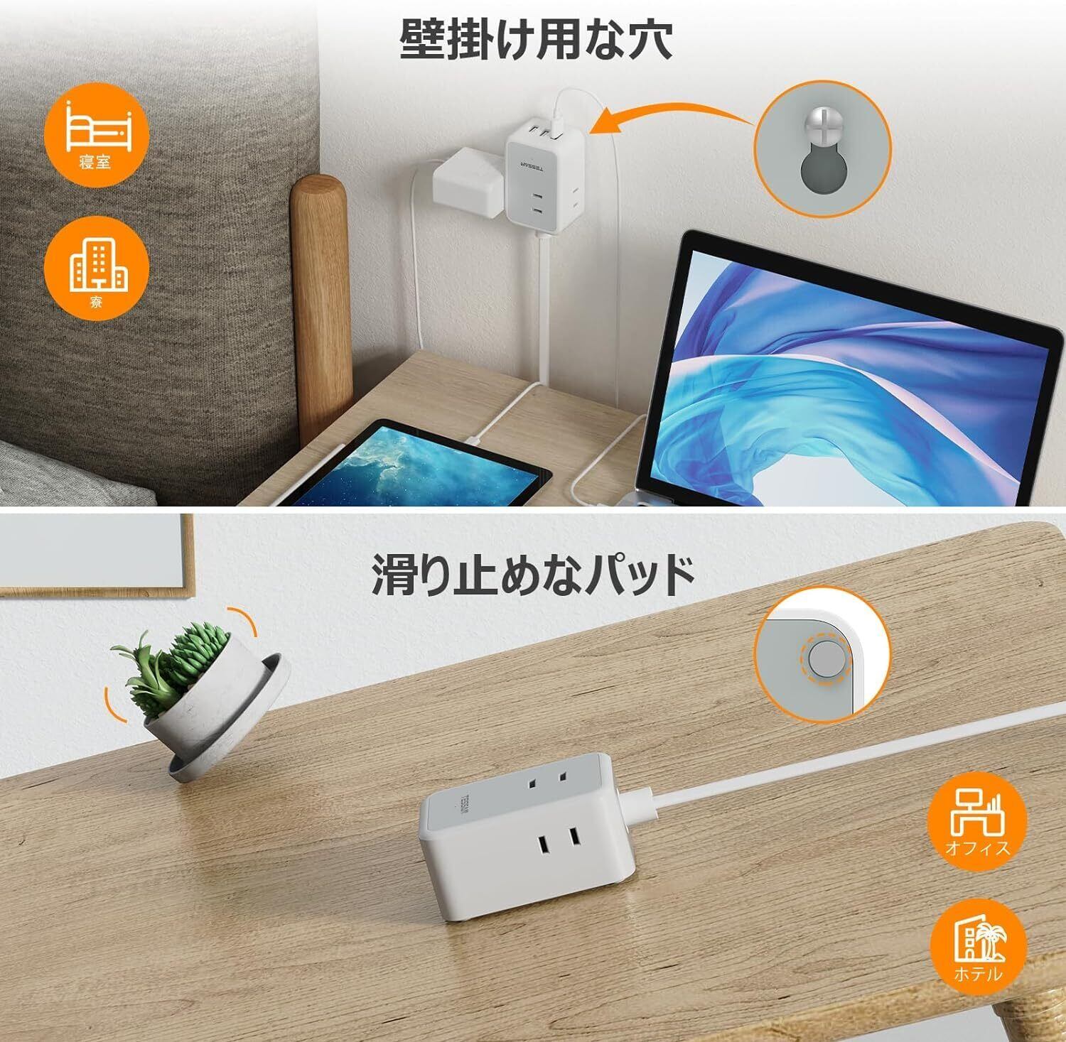延長コード 1m 短い 電源タップ usb たこあしコンセント テーブルタップ TESSAN タコ足配線 3個AC口 1個usb-c 2個type-a oa マルチ 電源コード 壁掛 卓上 小型軽量 出張 旅行