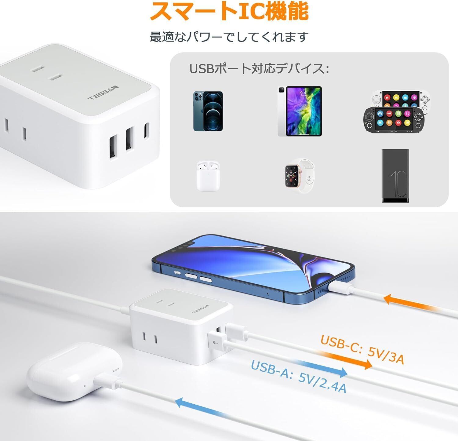 【USB-Cポート付のusb充電タップ】このusb 電源タップは二つのtype-aポート及び一つのtype-cポートがあります。type-aポート単独で使用する場合、最大 5V/2.4A出力を対応します。type-cポート単独で使用する場合、最大 5V/3.0A出力を対応します。デバイスに最適な電流を流す「スマート IC」により、安全に充電できます。