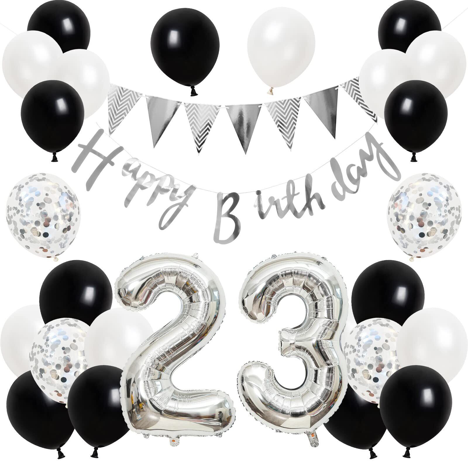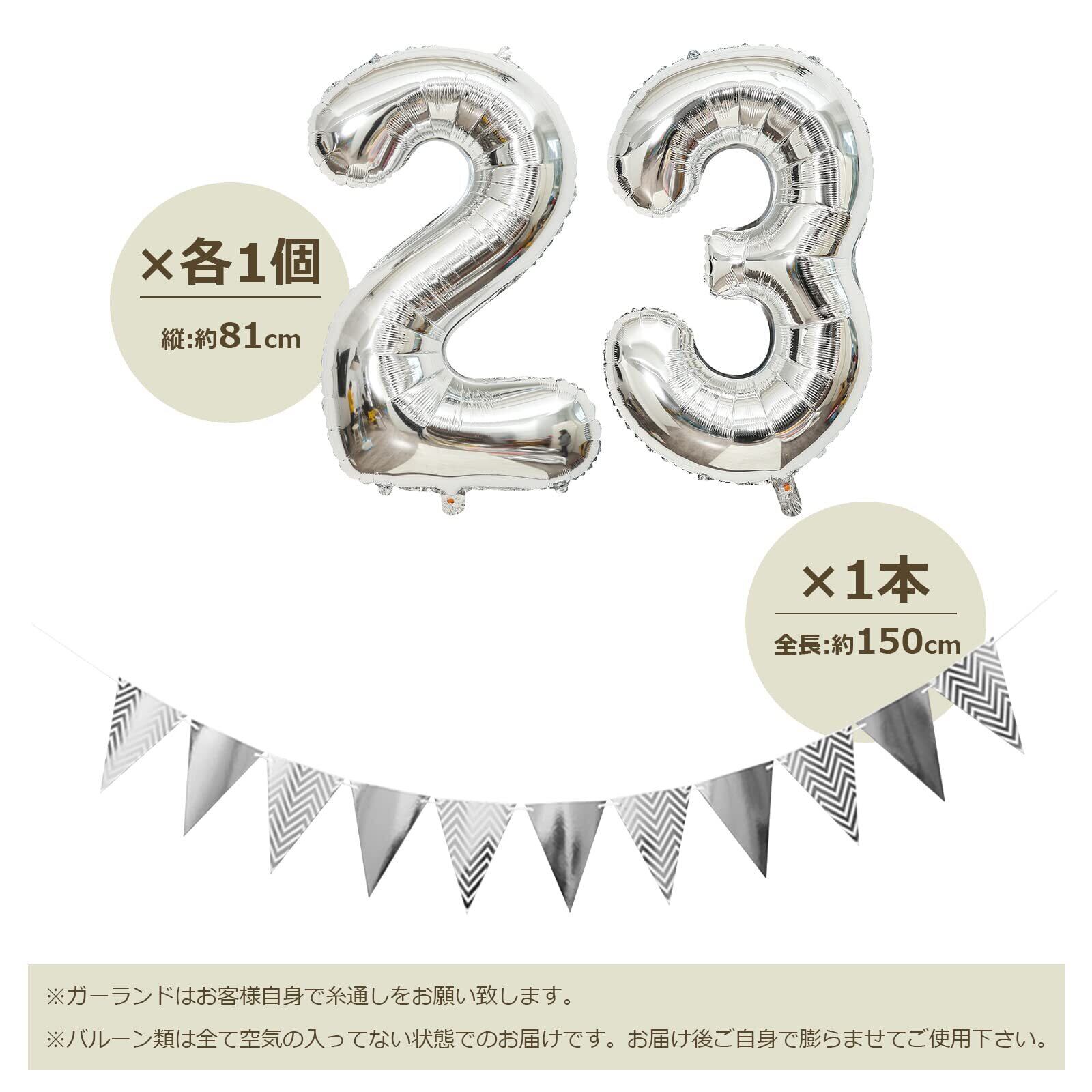 〔豪華なセット内容〕「23」数字バルーン×各1個、フラッグガーランド×1本、HAPPY BIRTHDAYガーランド×1本、紙吹雪入りバルーン×5個、ホワイトバルーン×10個、ブラックバルーン×10個、おまけ:リボン×1個、ドットシール×1枚。※商品の取り扱いは6才以上のお子様にお勧めします。ガーランドはお客様自身で糸通しをお願い致します。バルーン類は全て空気の入ってない状態でのお届けです。お届け後ご自身で膨らませてご使用下さい。