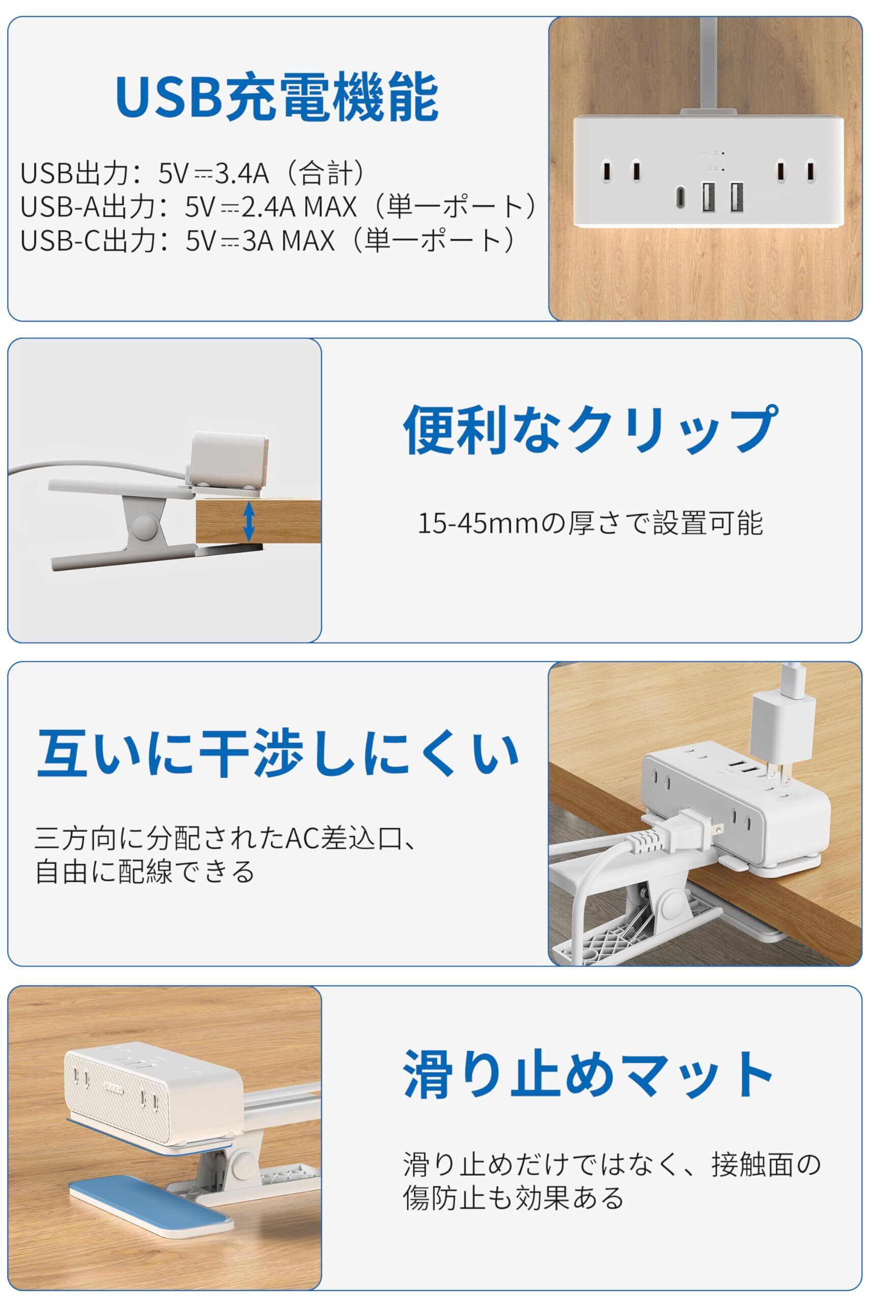 「クリップ機関付き」電源タップ本体と取り外しできるクリップ機関を搭載した多機能usb充電できる6個口電源タップです。付属のクリップを使用して、デスクや他の場所に簡単に取り付けることができます。これにより、家やオフィスをすっきりと保つことができます。挟むだけで配線できると、電源タップを固定の場所から解放して、使いたい場所で使えましょう。
