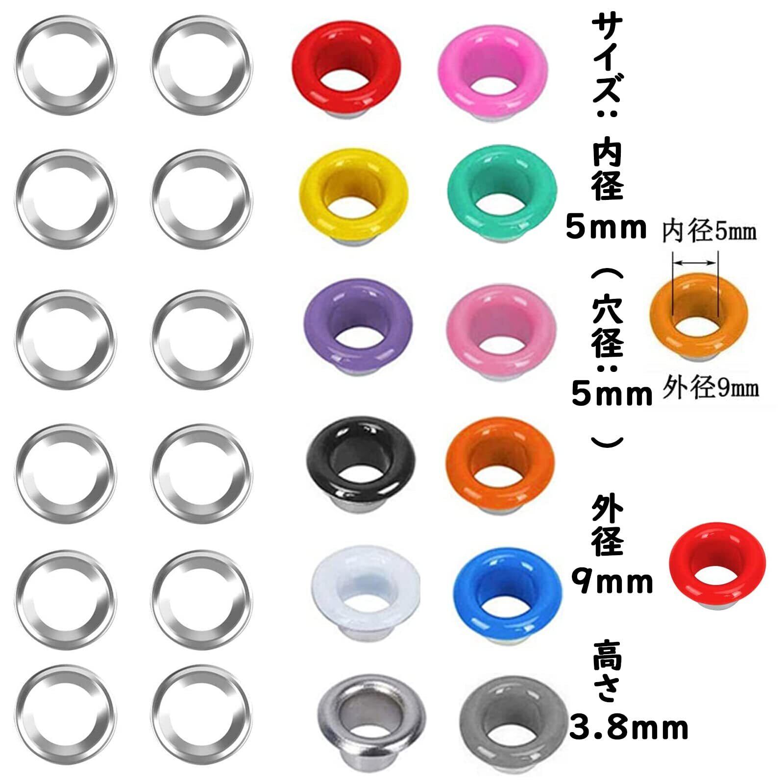 商品:600組両面ハトメの玉レザークラフトセット(12色*50組計600組)手芸、修理用カシメセット。型番:300# サイズ:内径5mm(穴径:5mm) 外径9mm 高さ:3.8mm。