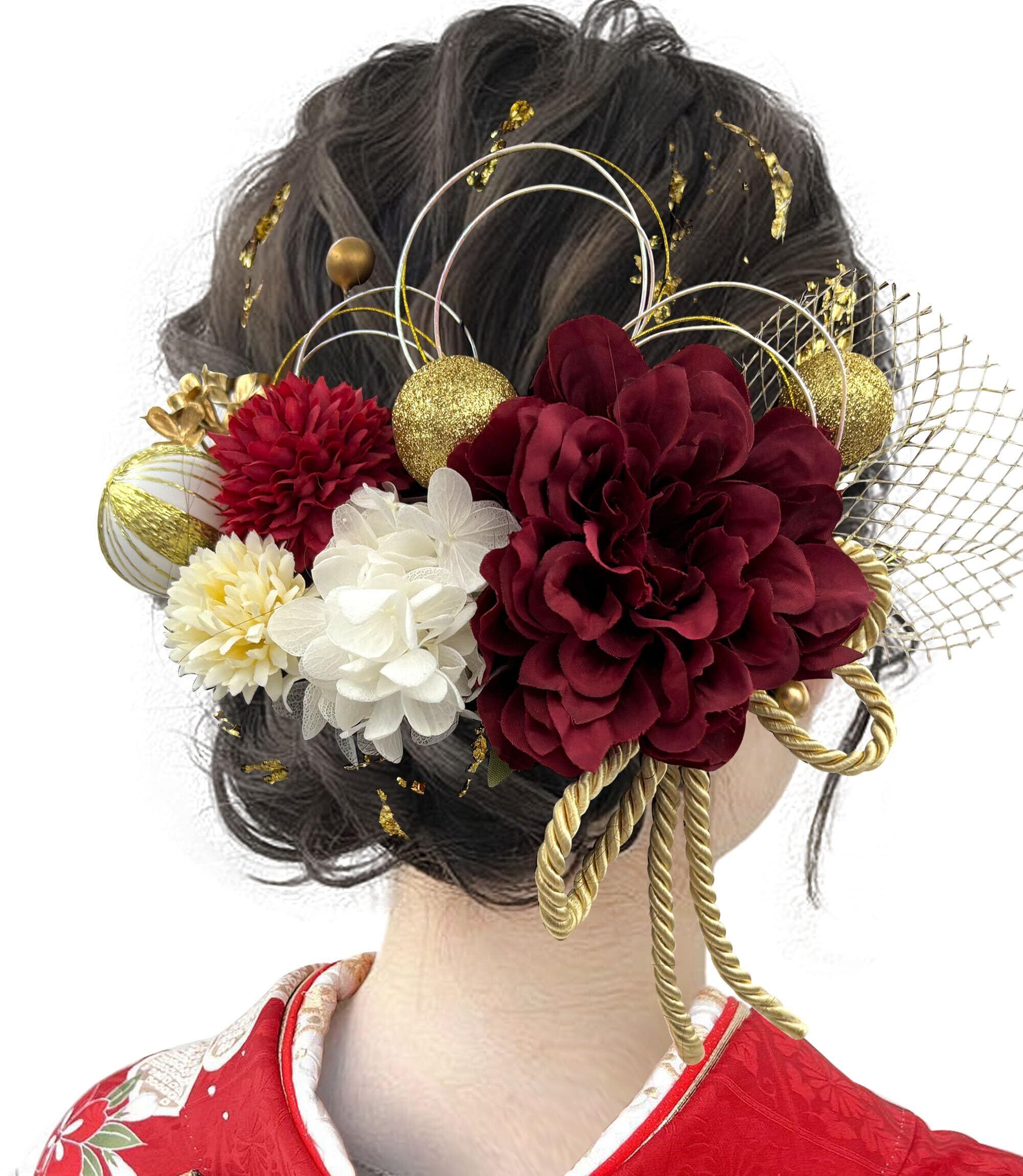 [JZOON] 成人式 髪飾り【10色展開】 ドライフラワー ダリア あじさい かすみ草 造花飾り ヘアアクセサリー 和玉 赤 ゴールド 水引 ヘッドパーツ 振袖 着物 卒業式 七五三 浴衣 袴 結婚式用 手作り 専用ケース付き Y3330