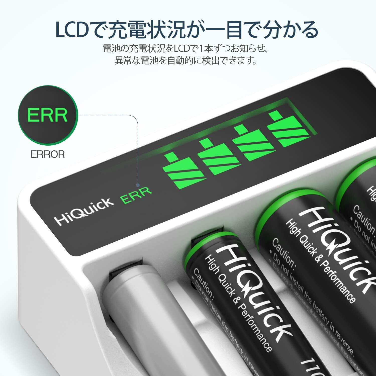 HiQuick 充電池充電器 単3 単4 ニッケル水素 ニカド充電池に対応 急速充電器 LCD付き 電池残量の表示 独立したスロット 単3形 単4形電池充電可能 Micro USB、Type-C入力ポート コンパクト 携帯便利 個別充電