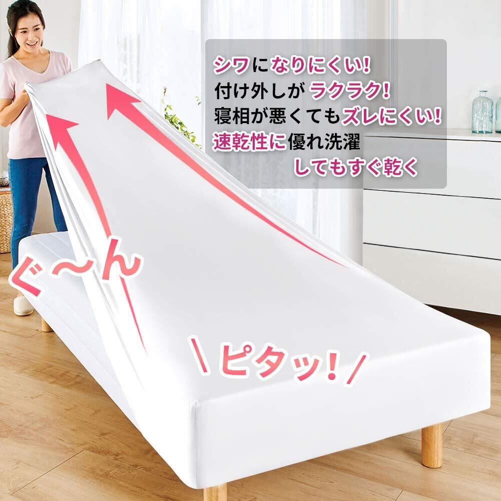 【ボックスタイプ】:シーツの裏面は全周ゴム仕様になっているので、すっぽり被せるだけで着脱簡単です!寝相を気にすることなく朝までぐっすり!