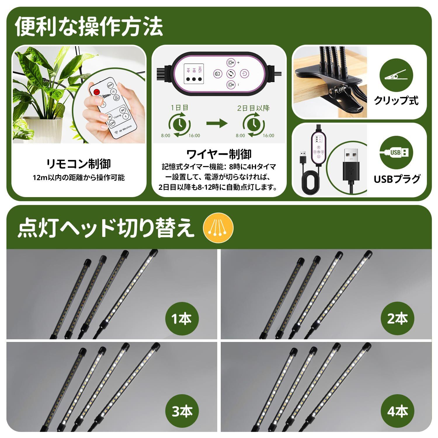 植物育成ライト 植物用ライト LED クリップ リモコン付き タイマー 記憶機能 育成ライト 植物 観葉植物 6000K ライト 白光 暖色光 10段階調光 4ヘッド