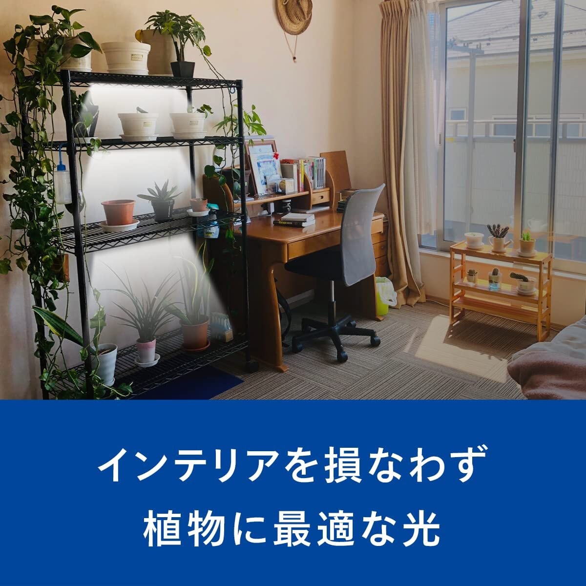 【使い方について】 育てる植物に合わせて、本製品と植物の距離を調整してご使用ください。例えば、観葉植物の場合、植物から10~25cm程度の距離をとって設置してください。また、棚下や玄関に設置して、間接照明としてもご利用いただけます。