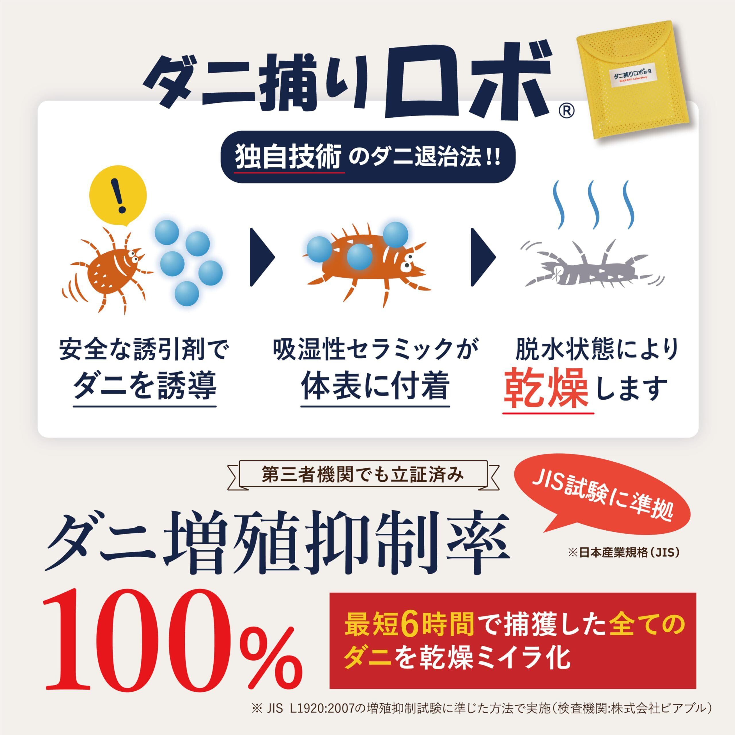 【2.驚異のダニ増殖抑制率100%】日革研究所が独自に開発したダニ捕獲方式によりダニ増殖抑制率100%を達成。ダニ増殖抑制率100%は、JISに準拠した「防ダニ試験(インテリアファブリックス性能評価協議会)」に準拠した方法で第三者機関にて立証されています。