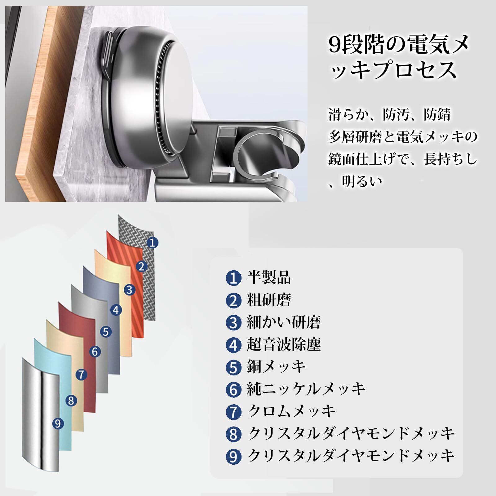 9層電気メッキ・防水性と耐久性: シャワーフックは厚みのあるABS素材で作られており、耐久性があり、防水性と防湿性があります。角度調整 多段階、9層のクロムメッキ技術、表面がつやつや、その他の浴室の部品と一体感。シャワーフックの設計は上下90°の角度調整と左右90°の自由回転をサポートします。