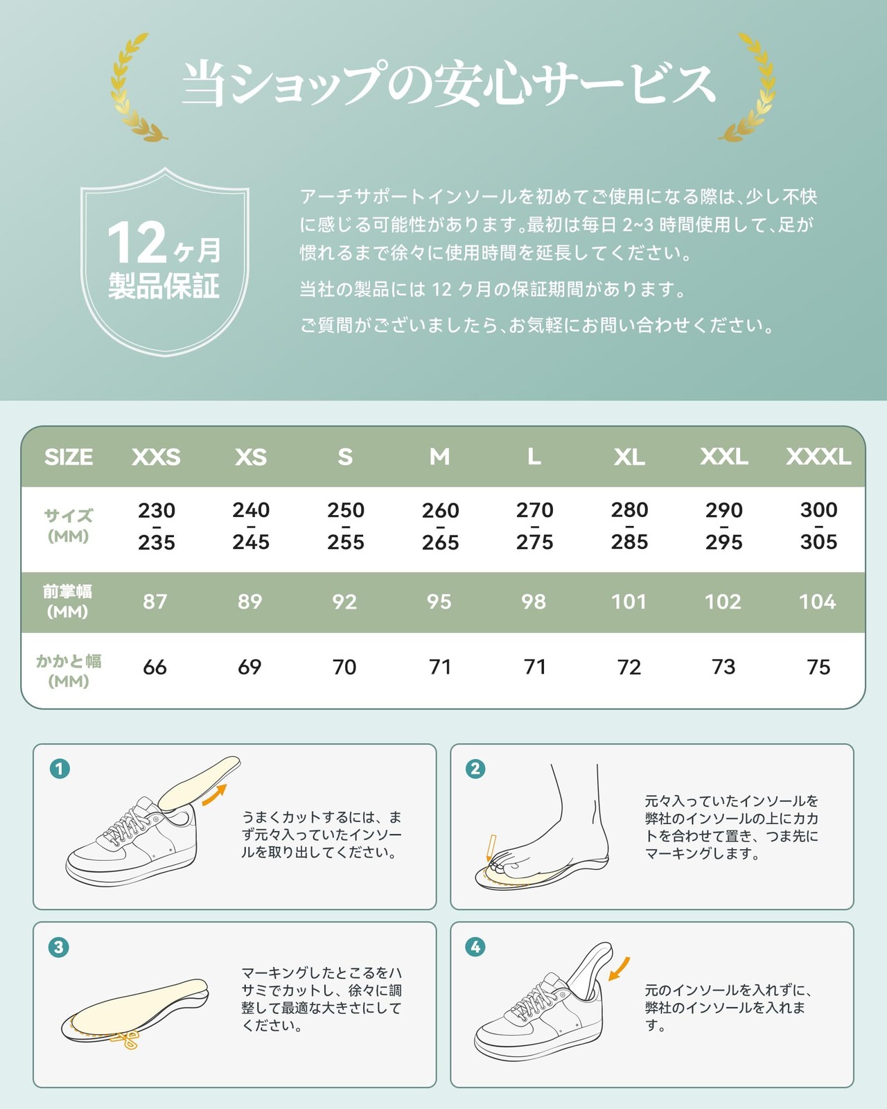 【適切なサイズ】アーチサポートインソールを足にフィットさせるために、アーチサポートインソールをご購入の際はサイズ表をご参照ください。 ご使用中にご不明な点がございましたら、ご連絡ください。