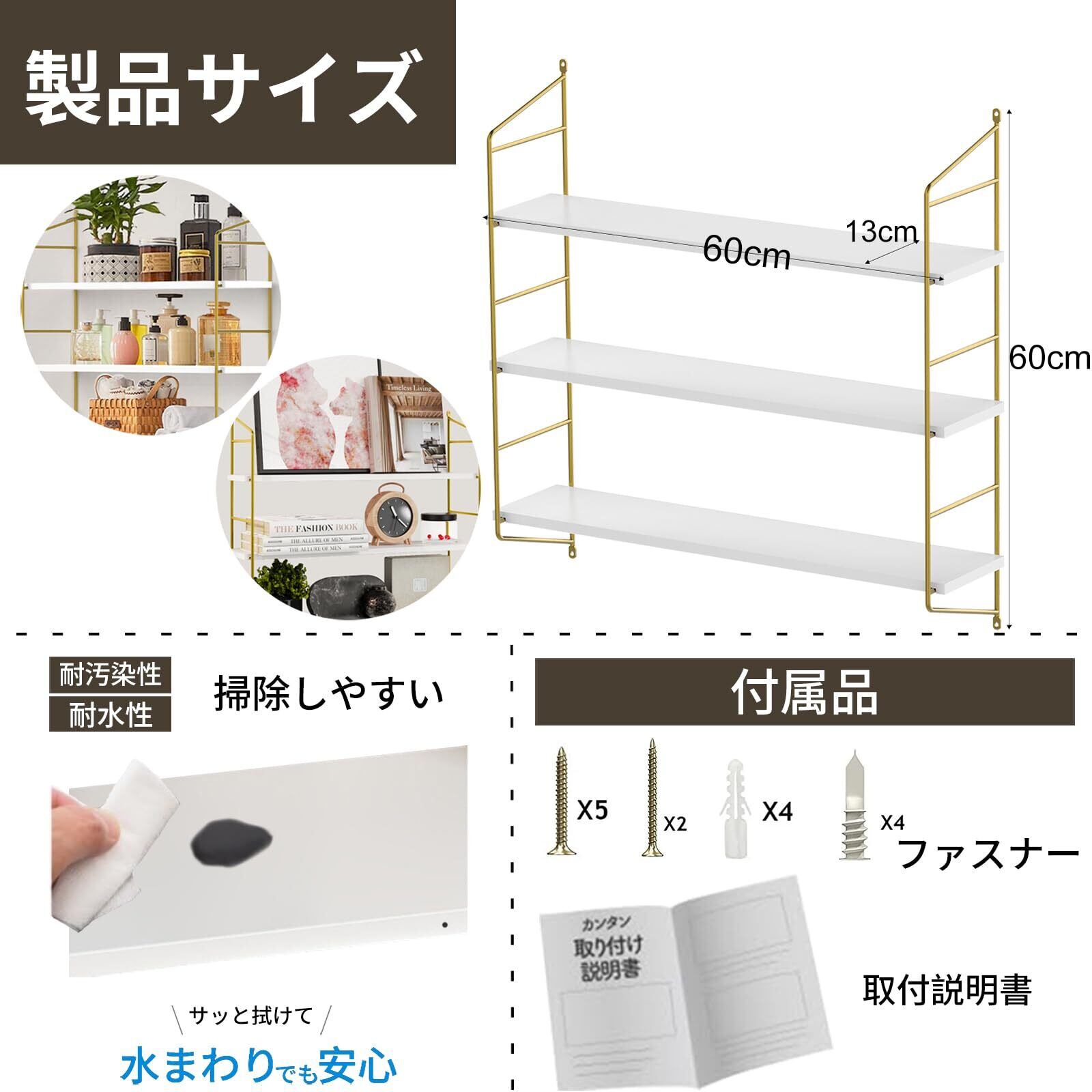 【実用的な収納棚・収納力抜群】壁掛け棚の幅は13cm、長さは60cm。棚板3枚が付いているため、収納性も良好で、空いている壁面スペースを有効活用することができます。1段の耐荷重は10kgなので、大量や大きめのアイテムを飾りたいときに重宝します。