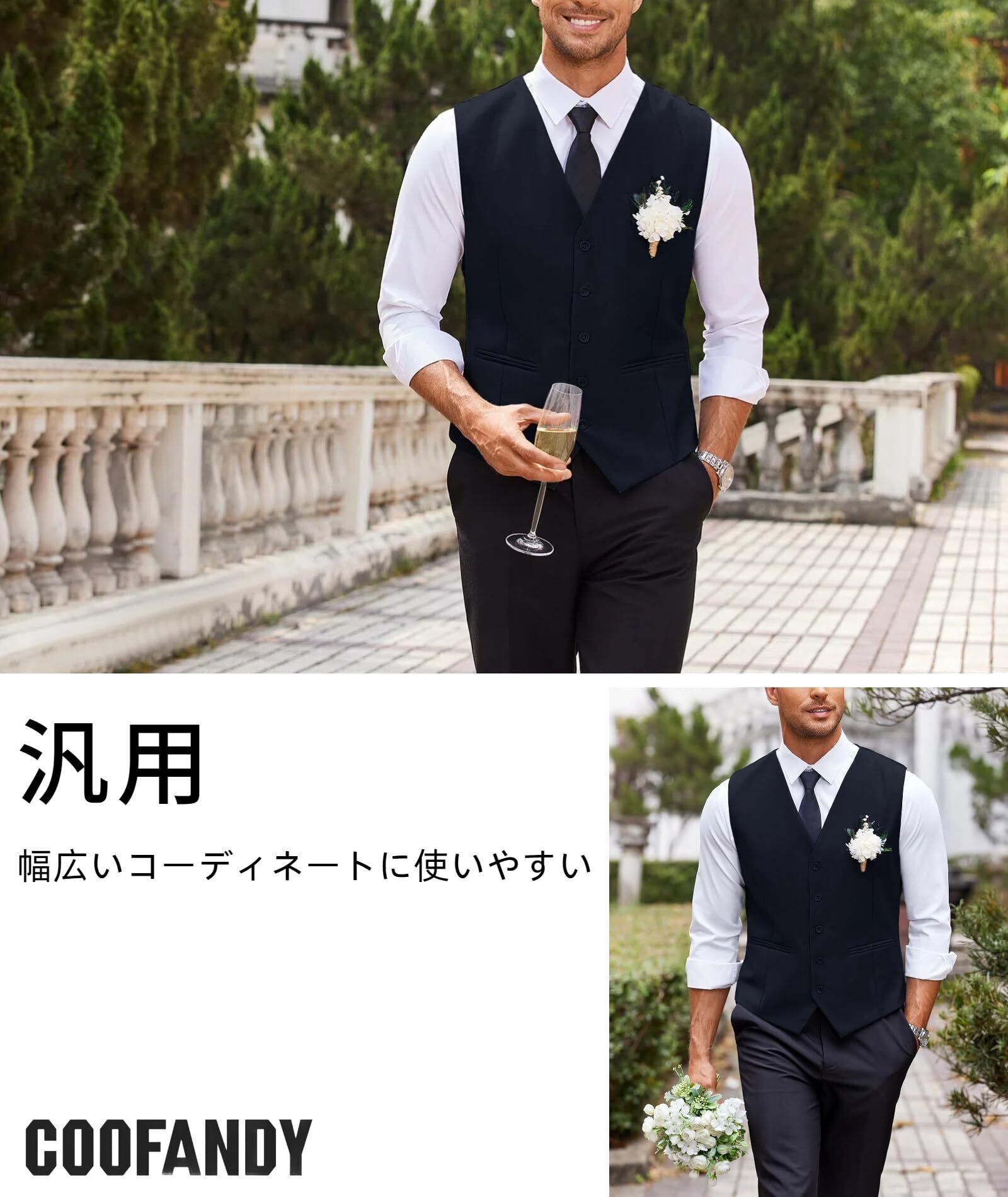 【新着商品】[COOFANDY] スーツベスト メンズ 襟なし Vネック ジレベスト 三つのポケット 胸ポケット 五つのボタン 大きいサイズ 尾錠付き フィット感調節 四季向け 結婚式 仕事場 ビジネス パーティー(S~XXL)
