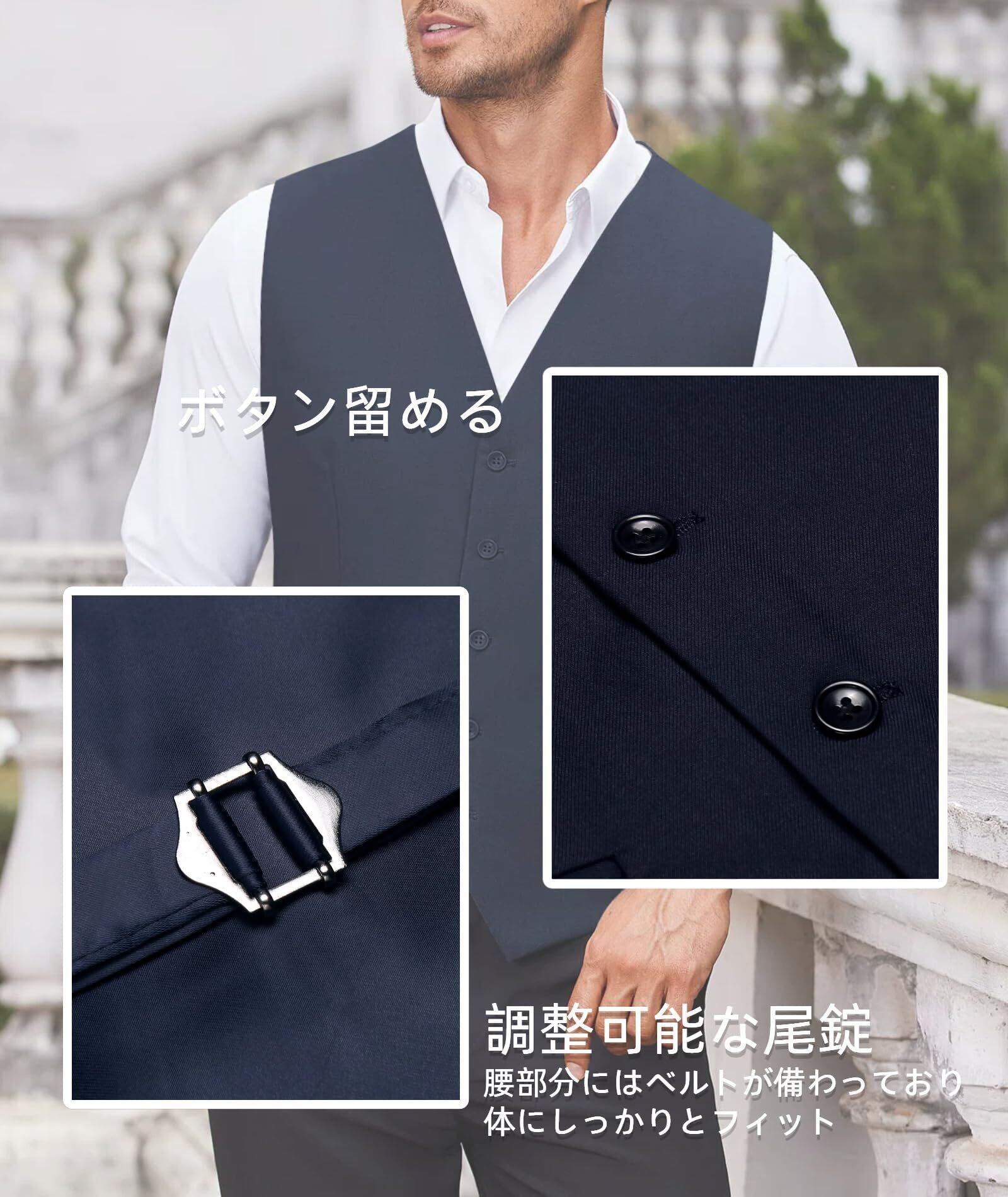 【体にしっかりとフィット】このベストは五つのボタンがあり、背面には調整可能なバックベルトがついています。身体のラインにスリムにフィットするため抜群の着心地を実感することができるでしょう。このスーツベストを着用すると立体的に見せて、よりスタイリッシュに仕上げることができます。