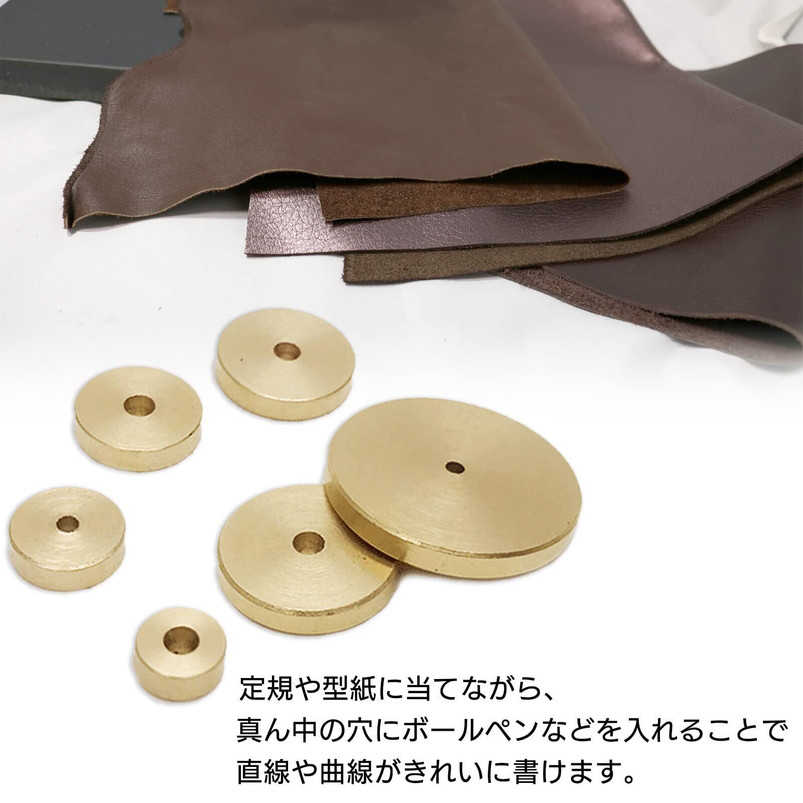 この真鍮製の丸型ヘリ定規セットは、レザークラフトや手芸の型紙作成時に役立つ便利なツールです。直径20mm、14mm、12mm、10mm、8mm、6mmの6種類のサイズが揃っており、幅広い用途で活用できます。型紙に合わせて正確な位置に線を引いたり、均一なマージンを確保する際に便利です。