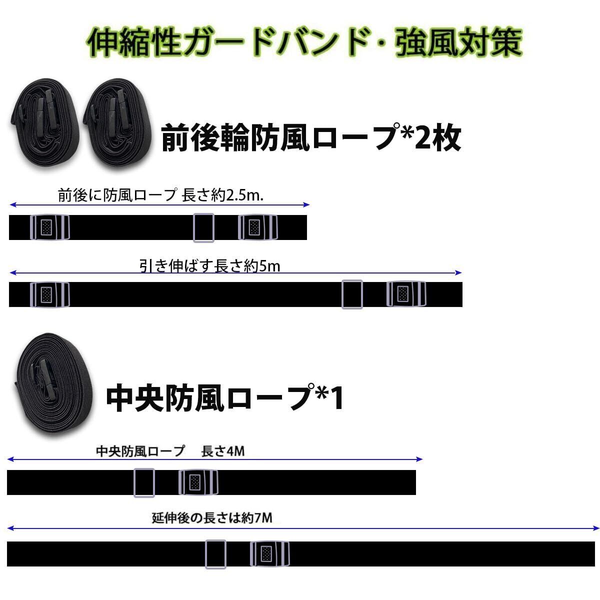 【商品仕様】前後に防風ロープ 2枚(長さ約2.5m、引き伸ばす長さ約5m);中央防風ロープ1枚(長さ約4m、引き伸ばす長さ約8m)。 重量:約250g。