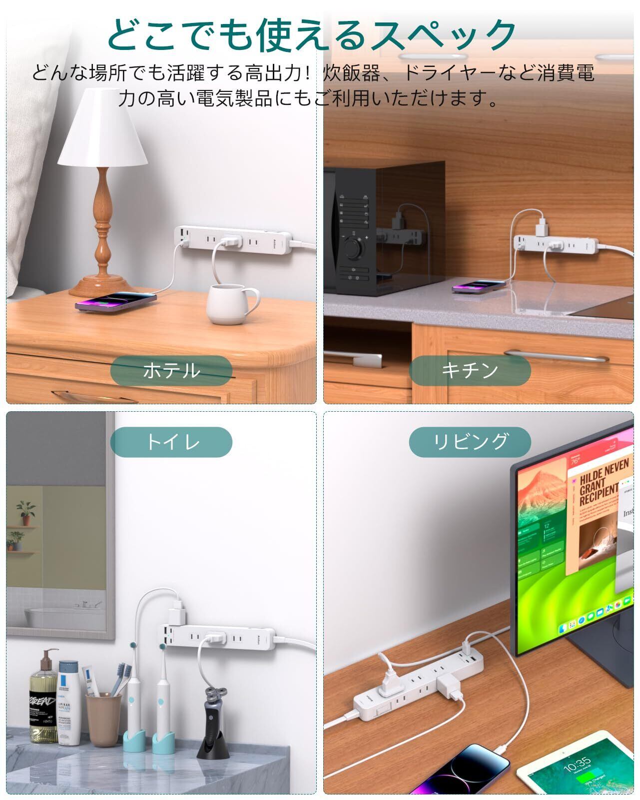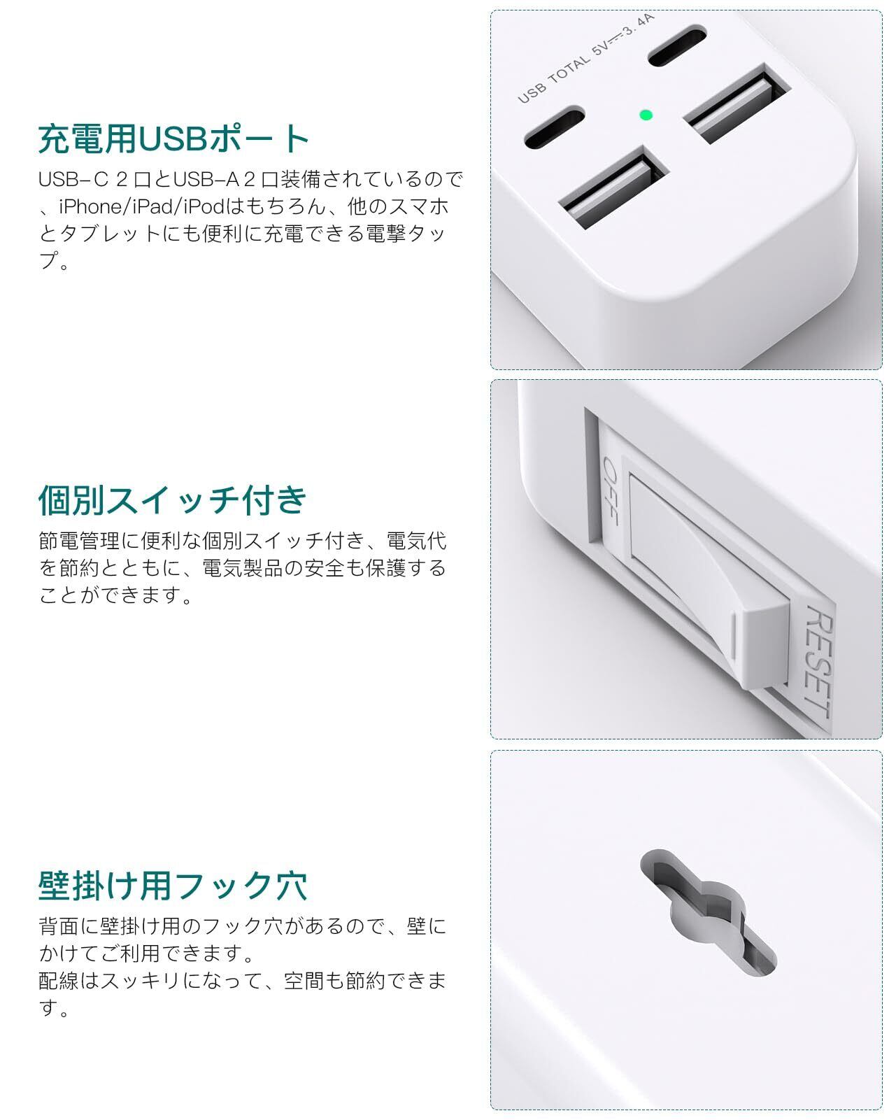 【10-in-1電源タップ&2Type-Cポート】電源タップ は新販売の携帯電話に対応するために2個typeCポートも特別に追加されており、typeCポートの充電ヘッドを購入する費用を節約できます。USBポート付だからアダプタ不要で、省スペースでスッキリにします。出張、会議室、自宅などで12台デバイスを充電できます。本製品は日本の電圧(100~125V)に合わせて設計されるので、日本国内、中国、米国または東南アジアでも使えます。定格を超えて使わないでください。(合計で 1400W 以下)
