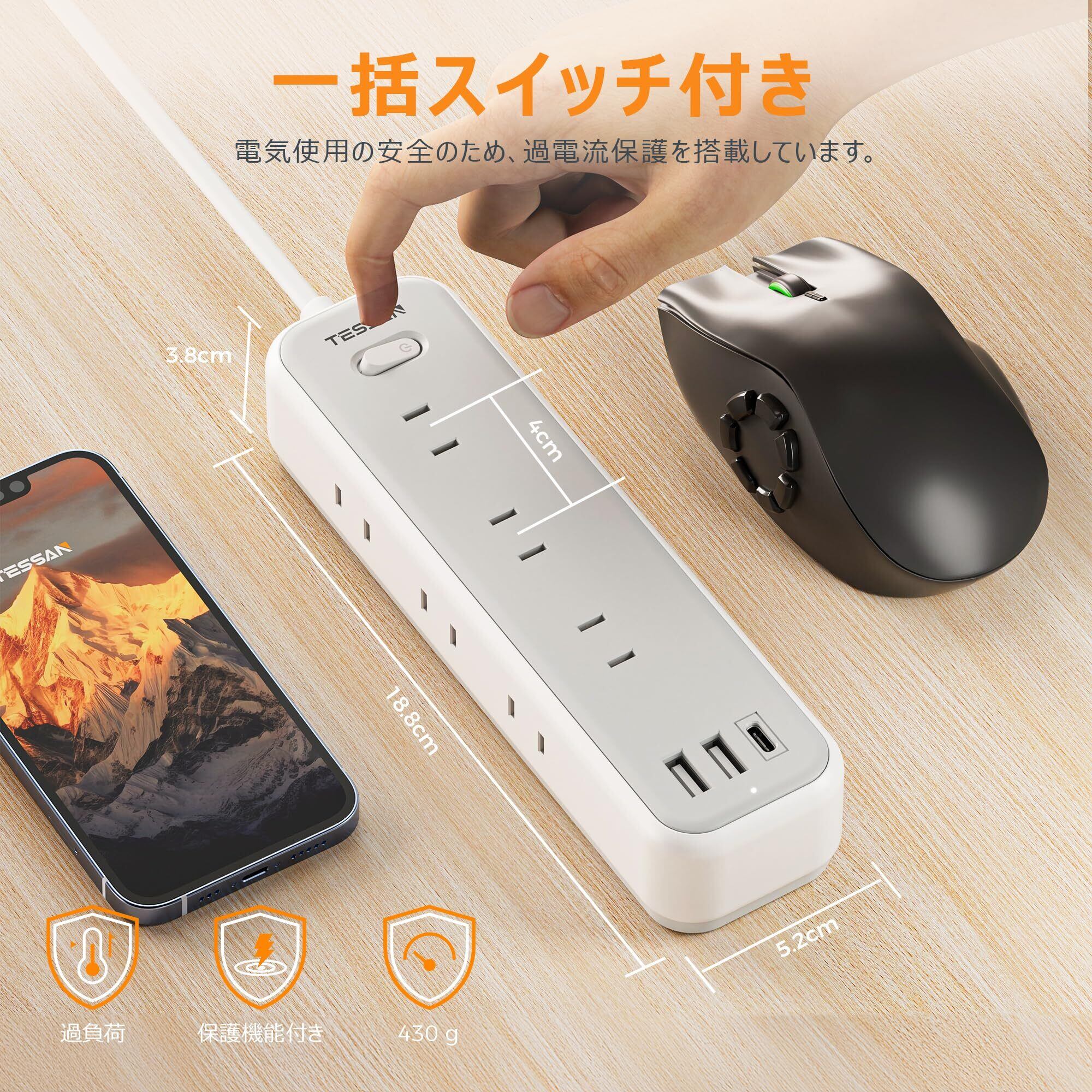 「安全に使える延長コード」このusb コンセントは、難燃性の高いABS 94V0素材で製造されており、電気火災を防ぐのに効果的です。全ての接続機器の電源を一括で管理できる集中スイッチが装備されています。過負荷時には内蔵されたブレーカーが自動的にトリップして事故を防止します。電源が入っているかどうかを一目で確認できるインジケーターライトが付いています。