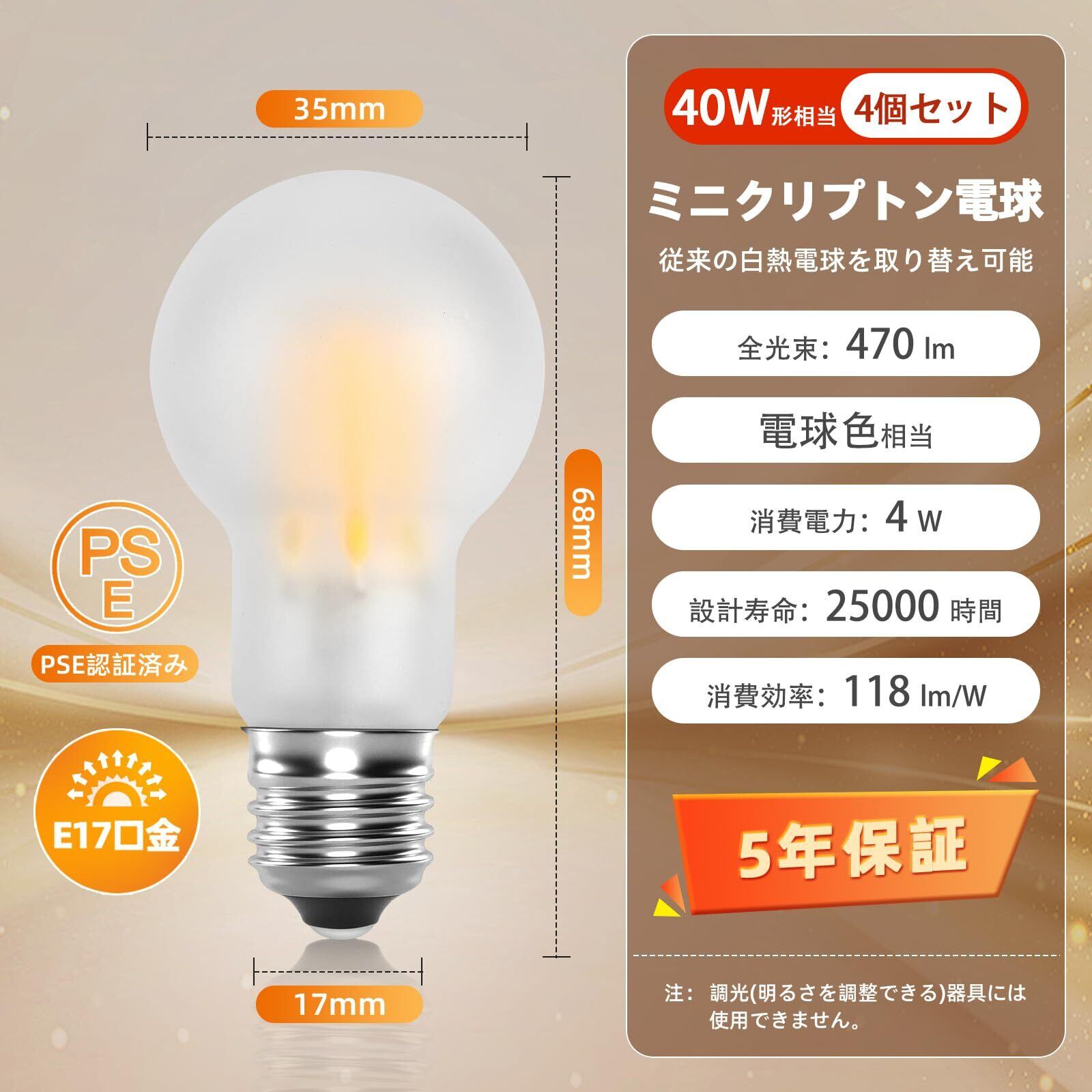 ミニクリプトン電球 E17口金 LED電球 電球色 40W形相当 470lm クリプトン フィラメント電球 全方向タイプ 省エネ 密閉形器具対応 断熱材施工器具対応 調光不可 4個入り