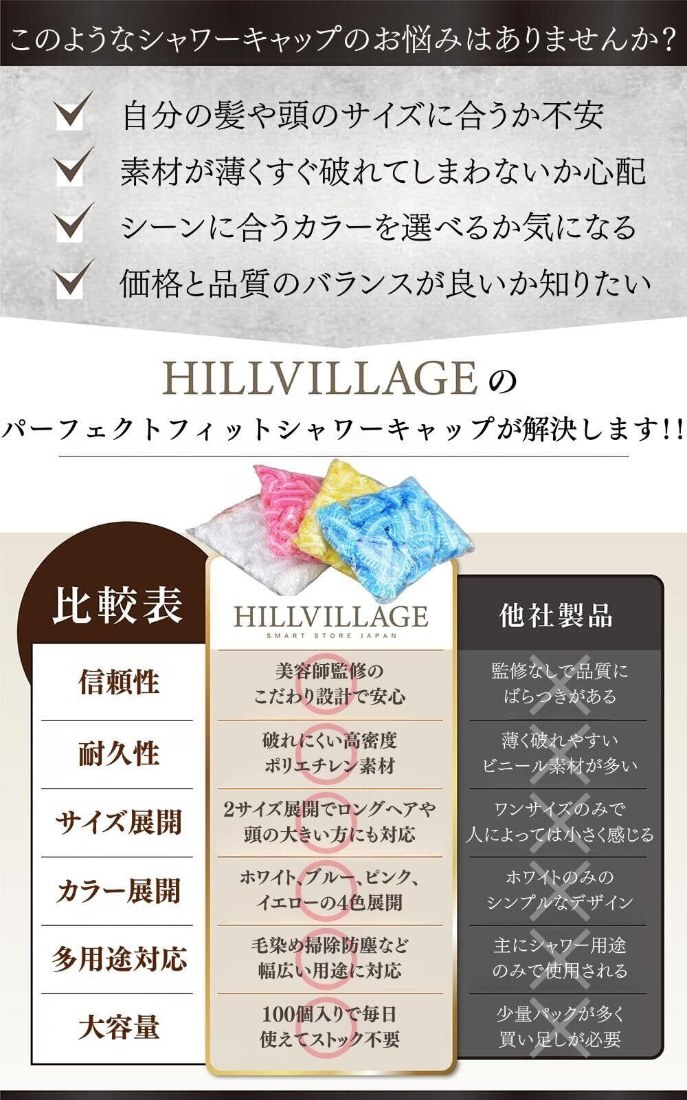 【4色展開で用途や気分に合わせて選べる】本商品は、ホワイト・ブルー・ピンク・イエローの4色展開。清潔感のあるホワイトはどんなシーンにも馴染み、爽やかなブルーは美容院やサロンの業務用にもおすすめ。やわらかい雰囲気のピンクはヘアケアやバスタイムを楽しくし、明るいイエローは気分を上げたいときに最適です。従来の透明シャワーキャップと違い、汚れが目立ちにくく、用途や好みに応じてカラーを選べるのが特長です。