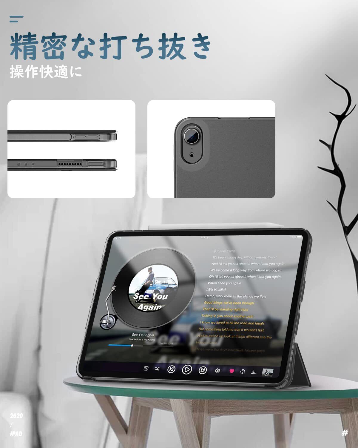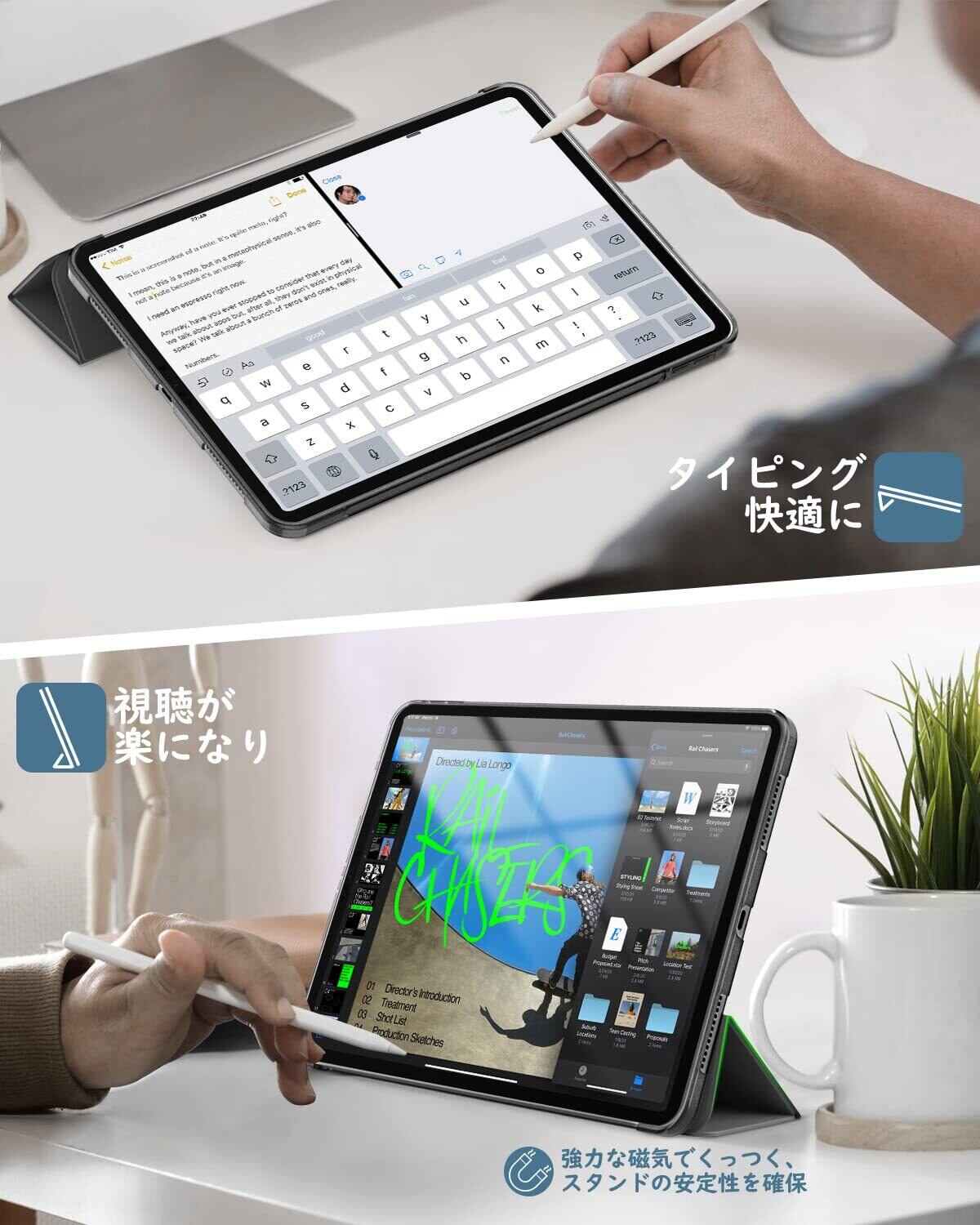 「着装簡単」 簡単に着装できて、ケースを装着したまま電源ボタン、音量ボタン、写真を撮る、充電等すべての機能にアクセスできます。ApplePencil USB-C(iPad Air 11インチ用)の磁気吸着、Pencil Pro(iPad Air 11インチ用)及び ApplePencil第2世代(iPad Air 第5世代/第4世代 10.9インチ用)のワイヤレス充電に対応できます。