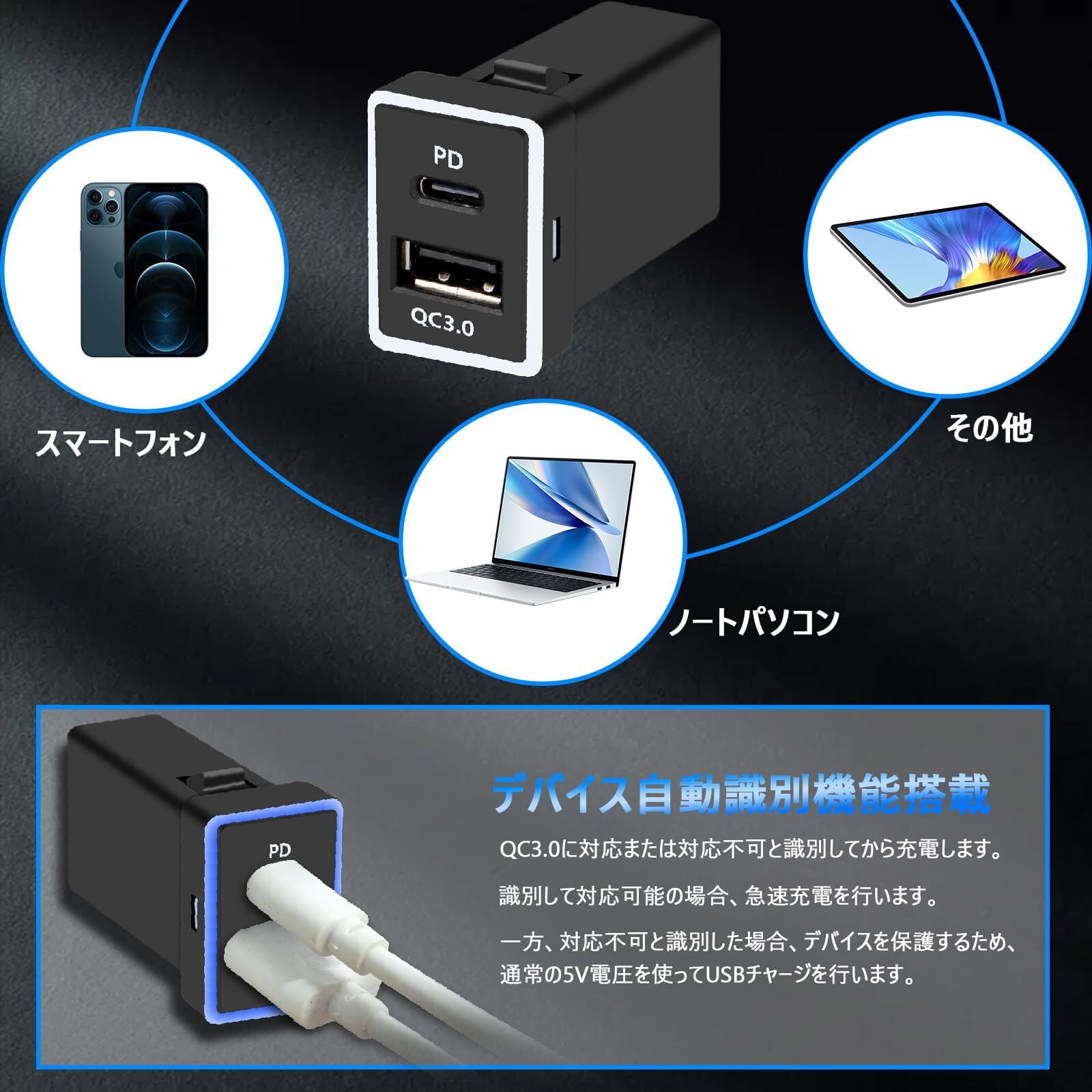 【4倍超高速充電】弊社の車用usbポートはPD(Type-C)&QC3.0(Quick Charge3.0)を対応しています。市販の普通充電ポートより4倍の充電効率上昇!