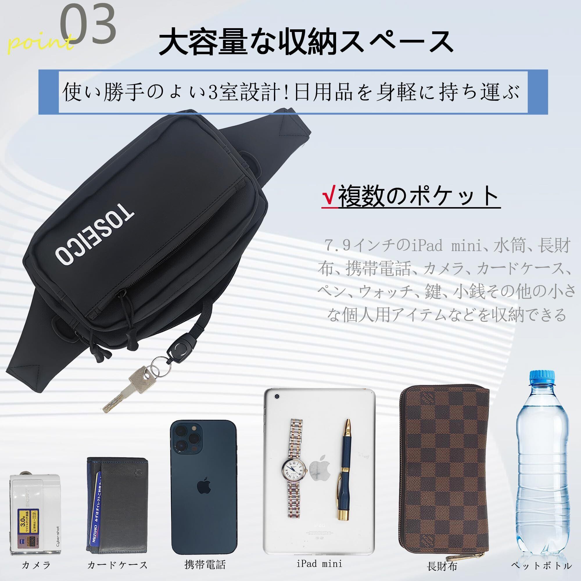 【コンパクトだが大容量】全体サイズ:長さ23x高さ13.5x幅(13+5)cm、①メインポケット23×13.5×7.5cm②中のジッパーポケット21×10×4.5cm③フロントポケット21×8cm。重さ:317g、使い勝てのよい3つのポケットデザイン、重く感じではなく収納十分です。ウエストポーチは最大500MLのペットボトル、7.9インチのiPad mini、長財布や一眼レフカメラの収納は楽々。二つの小分けポケットがあるため、モバイルバッテリー、運転免許証、名刺入れ簡単に収納できる。伸縮式のキーホルダーで鍵の紛失を防げます。他の小物と混じってしまうことを防ぐための 取外せるキーストラップを装備。フロントポケットには毎日使用される小さなアイテム(ペン、パスポート、小銭その他の小さなアイテムなど)でも簡単に保存できます。お勧めのランニング ポーチです。
