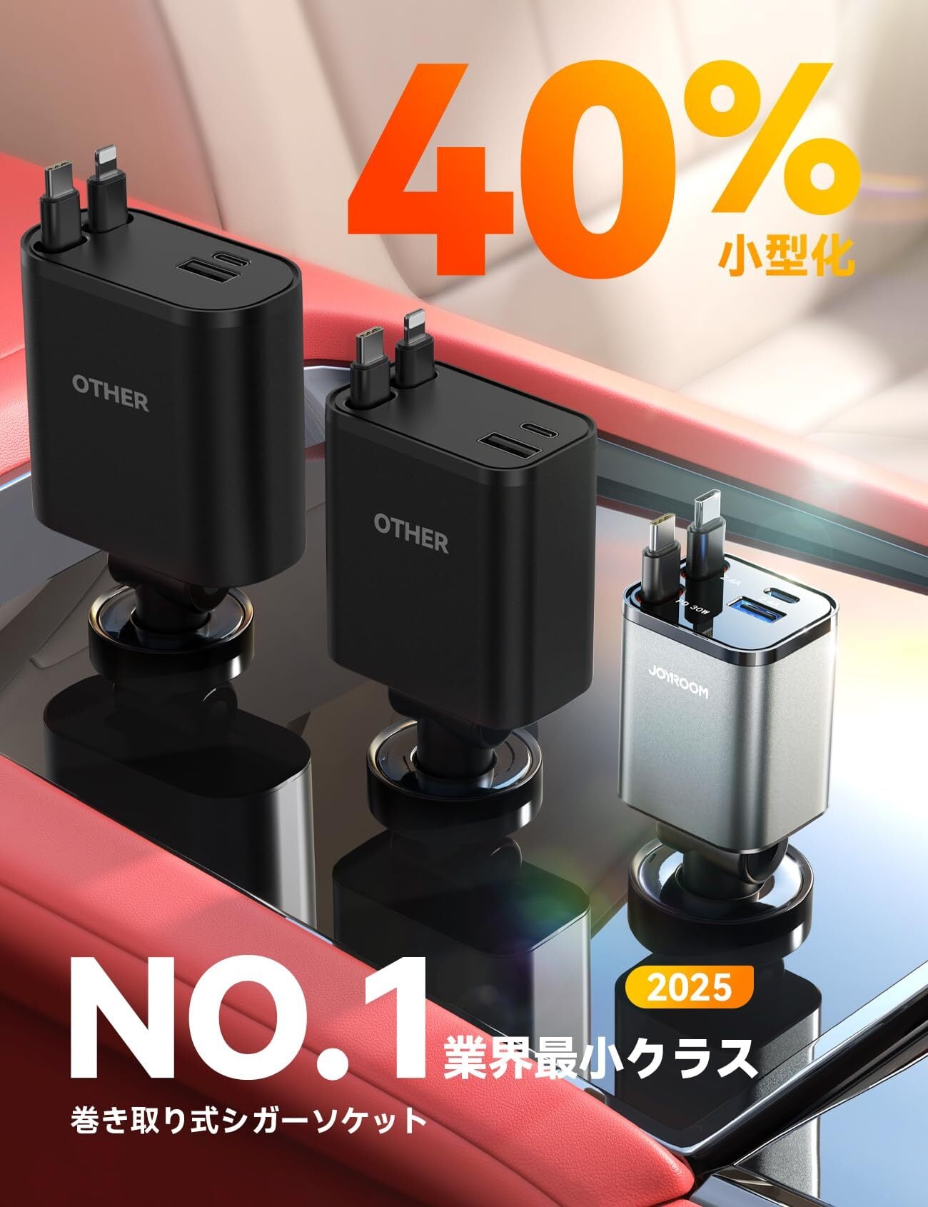 【業界最小クラス!40%小型化でスペース節約】 最新設計により、従来品と比べ40%の小型化を実現(4.50cm×3.78cm×12.98cm)!一般的な車 充電器 巻き取りと比べても圧倒的にコンパクトで、車内のドリンクホルダーやダッシュボード周りにスッキリ設置可能。他社製品のように大きすぎて邪魔にならず、快適なドライブをサポートします。