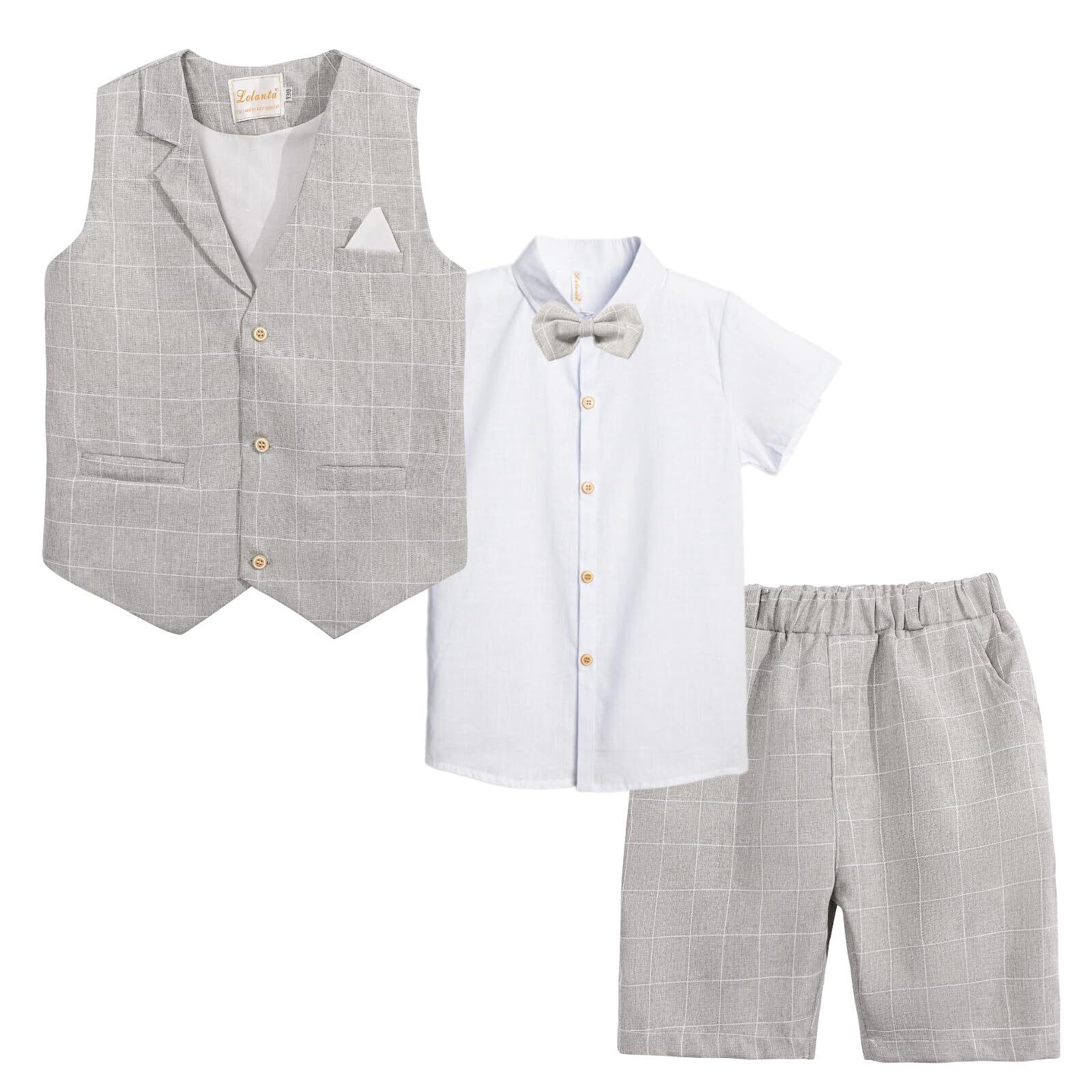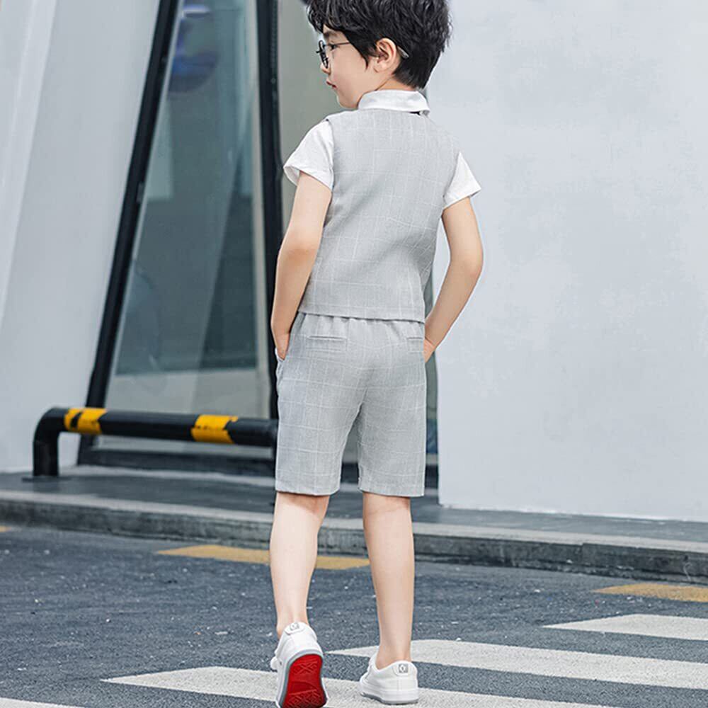 【新春セール】[LOLANTA] 子供 スーツ 男の子 フォーマル チェック柄 夏 半袖ワイシャツ 半ズボン ベスト 蝶ネクタイ グレー 結婚式 発表会 七五三 4点セット(90-160cm)