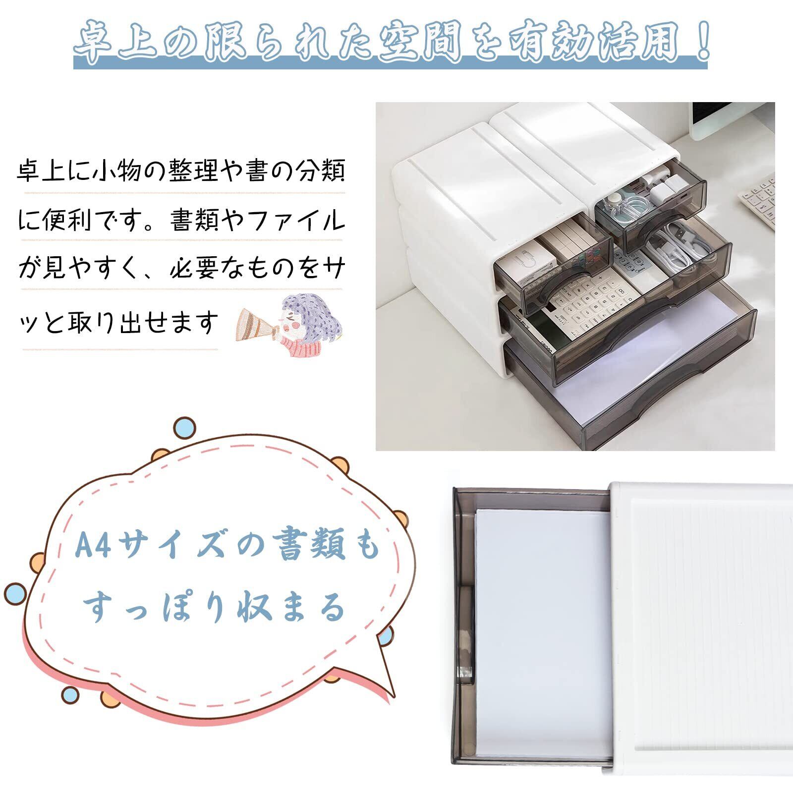 『レターケースとしてA4サイズの書類の分類&整理に』A4用紙が入れられる卓上小物収納ケースです、2段の引き出しでファイル、雑誌、ノートなどたくさんの資料を種類別に分けて収納することができます、レターケースの各段の高さは約9㎝と設計されており、たくさんの資料を収納・整理できます。