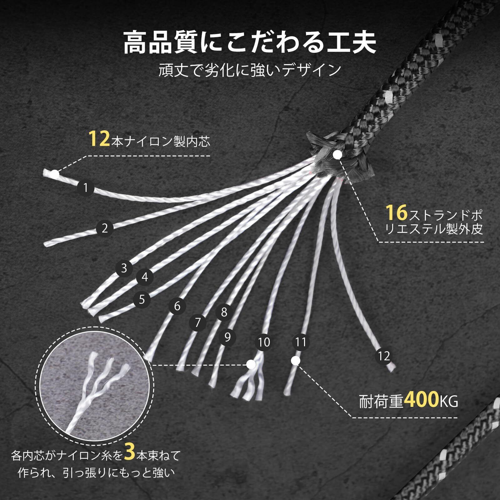 【耐荷重400KG】DANOFYテント用パラコードはナイロン製内芯とポリエステル製外皮からなり、各内芯がナイロン糸を3本撚り合わせて合計12芯で作られた張りに強いガイロープです。アウターが16ストランドで緻密に編まれておるこのガイロープ 4mmは柔らかくて軽量でありながら、耐摩耗性と耐荷重性が大幅に向上しています。この頑丈な構造のおかげで、弊社のテントロープは最大400kg(880ポンド)の耐荷重に至って、ほとんどの使用中での破断がご心配なくなります。