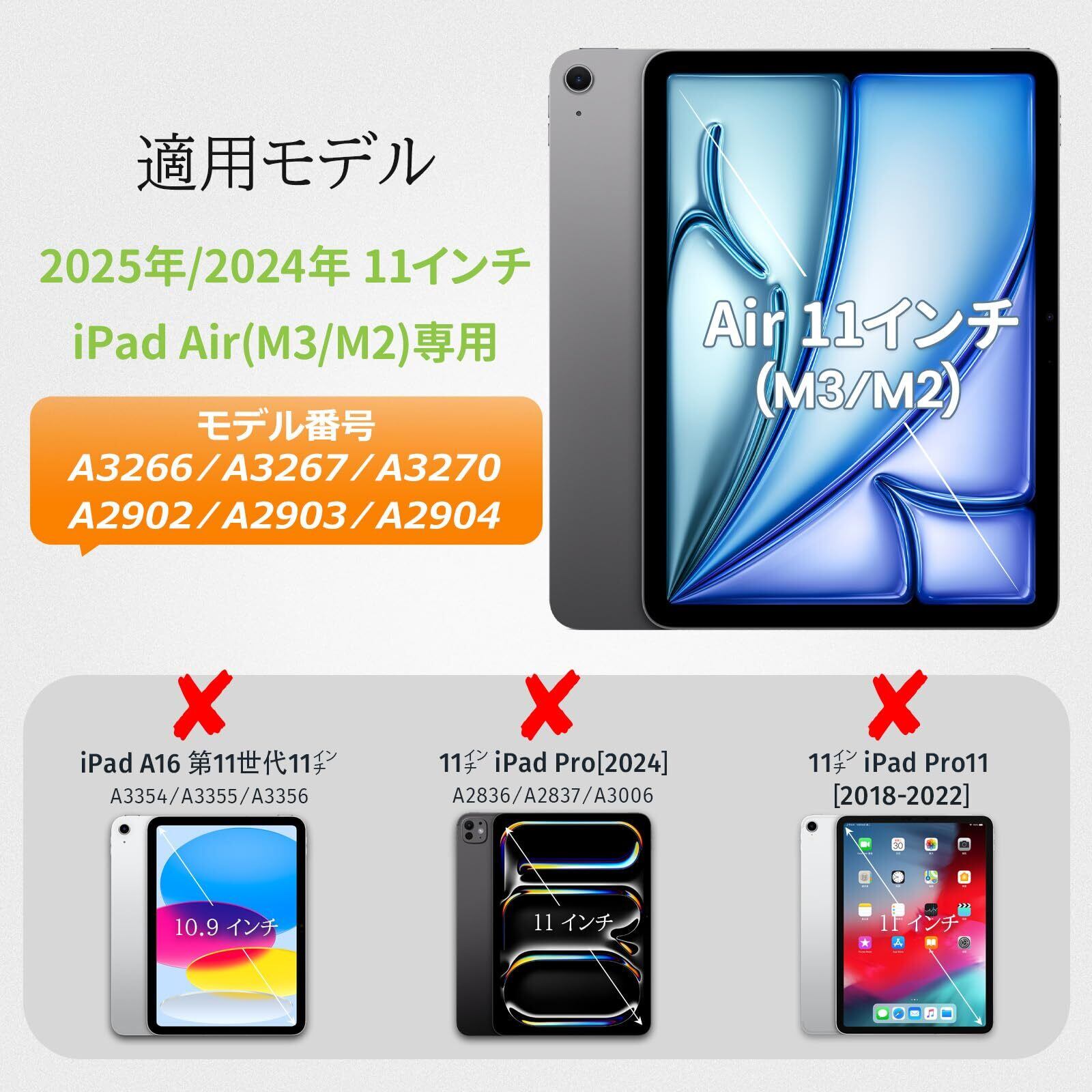 対応機種:本品は iPad Air 11インチ(M3/M2) 2025/2024 専用デザインケースです。モデル番号: A3266 A3267 A3270 A2902 A2903 A2904だけに適用されるため、ご購入前に必ずご確認ください。※ご注意:iPad Air第5/4世代には適用されないためぜひご確認ください