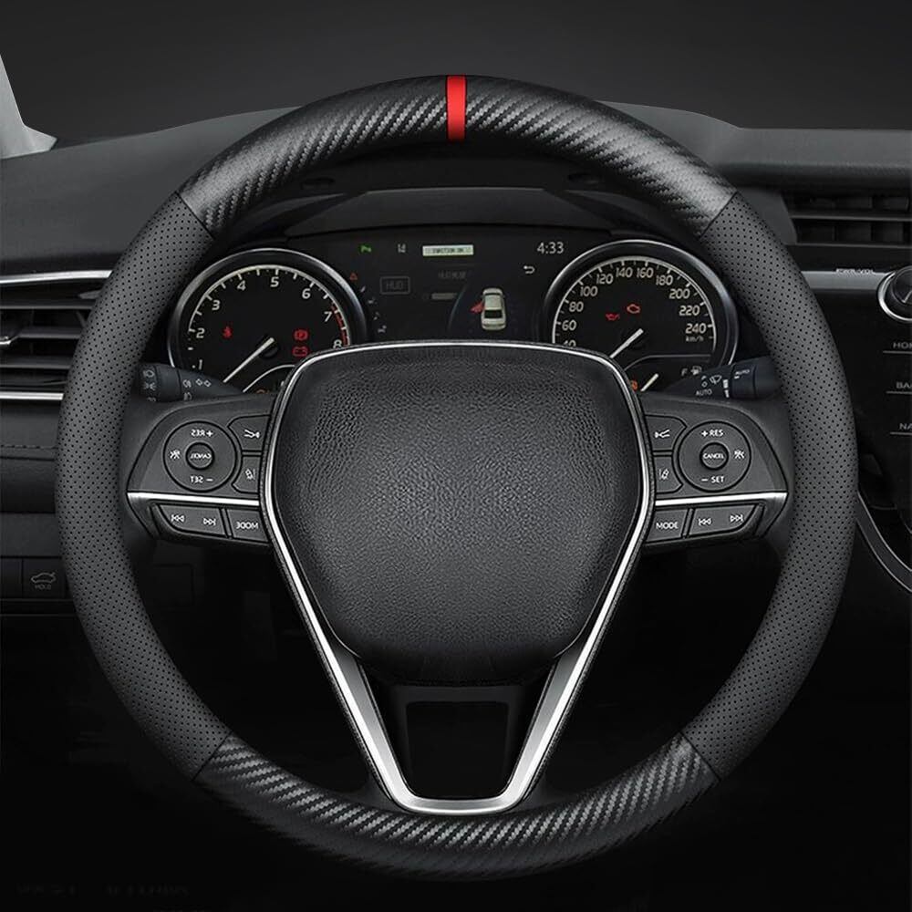 Carodi炭素繊維皮革自動車ハンドルカバー、快適滑り止め、汎用15インチ(黒+赤)