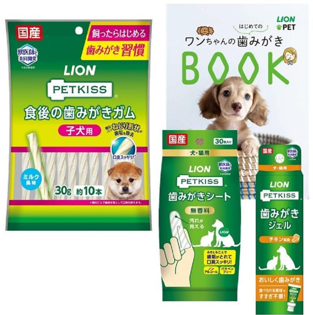 ライオン 犬の歯磨きはじめてセット ペットキッス PETKISS ワンちゃんの歯みがきはじめてセット 食後の歯みがきガム 子犬用+歯みがきチキン風味+歯みがきシート無香料+歯みがきBOOK