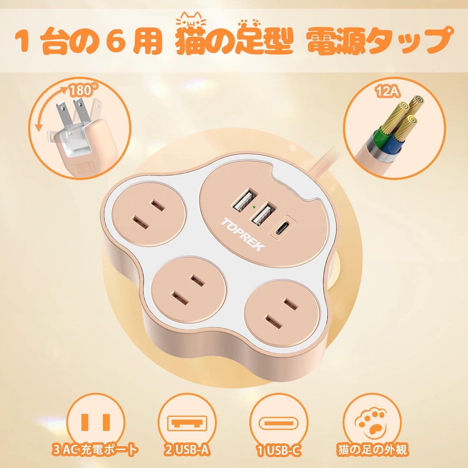 【数量限定】TOPREK 猫の足型 電源タップ ピンク USB コンセント 延長コード 1.5M 3個口 3個USB-C (USB-C 20W PD3.0 急速充電) 1500W/12A 180°スイングプラグ 雷サージガード オフィス/家庭用/卓上小型軽量出張/旅行 (付:強力両面アクリル)