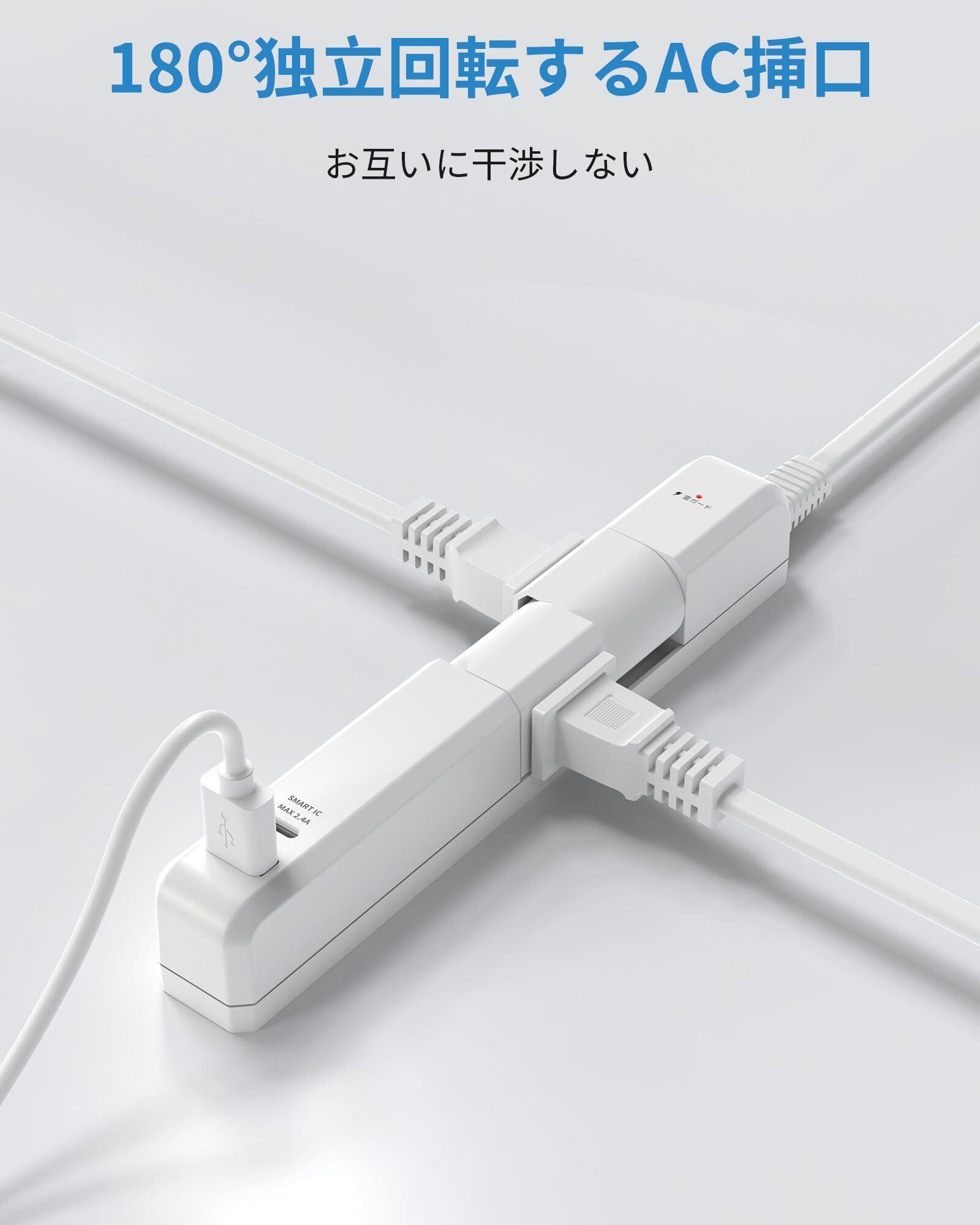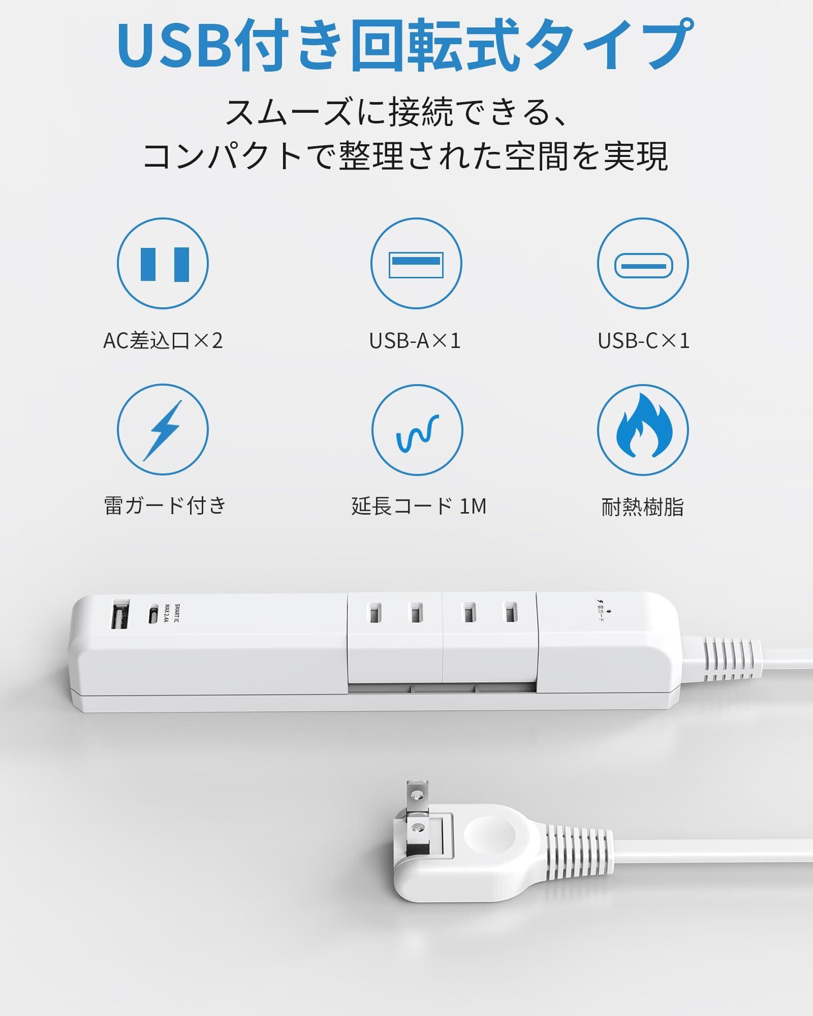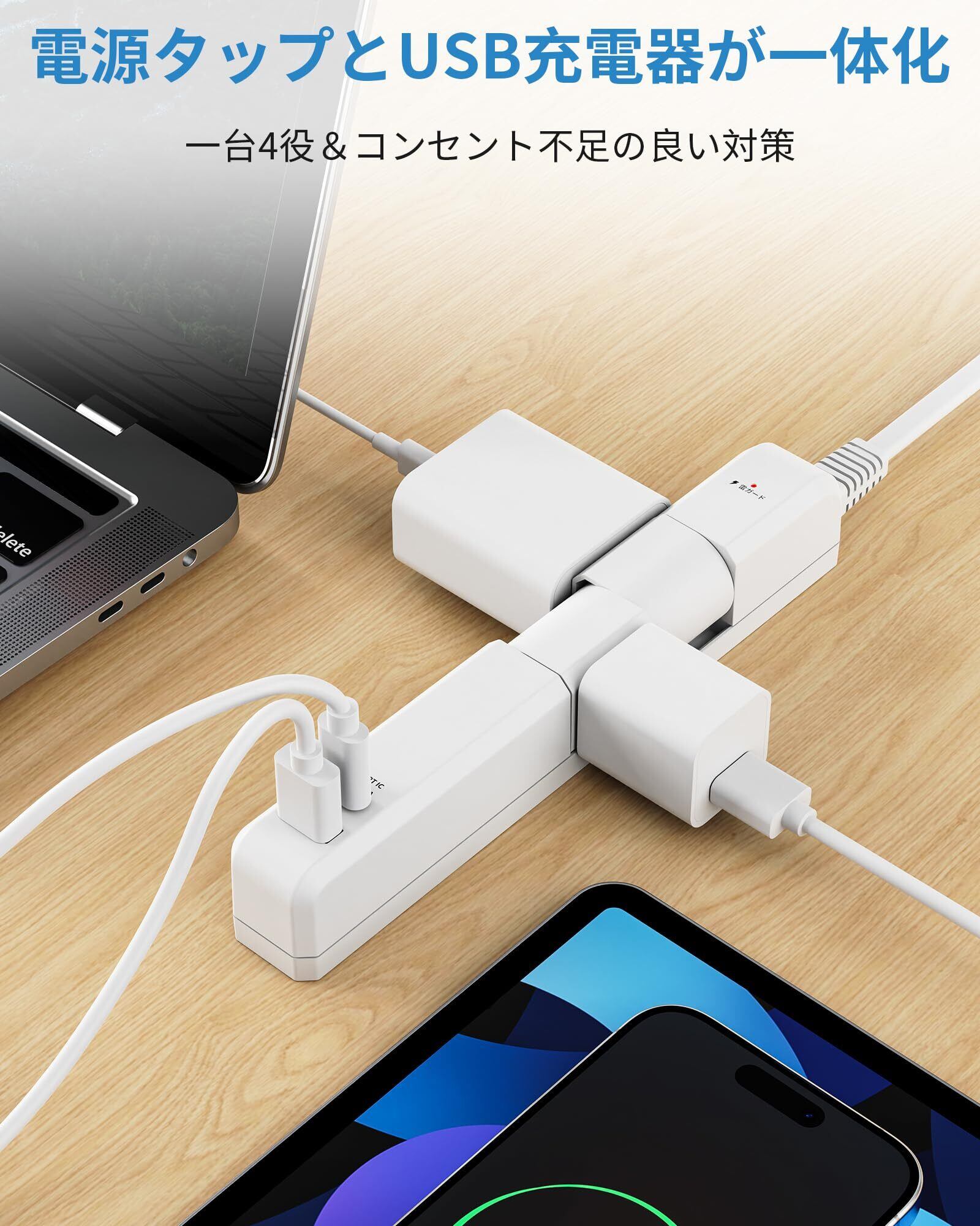 【1台4役・回転式タップ】1台で最大4台のデバイスを同時に充電できるusb付き回転電源タップ。1個USB-Cポート、1個USB-Aポートと2個独立して回転する差込口を配置。AC口は互いに干渉しない設計で、大きなアダプターも安心して使用可能です。
