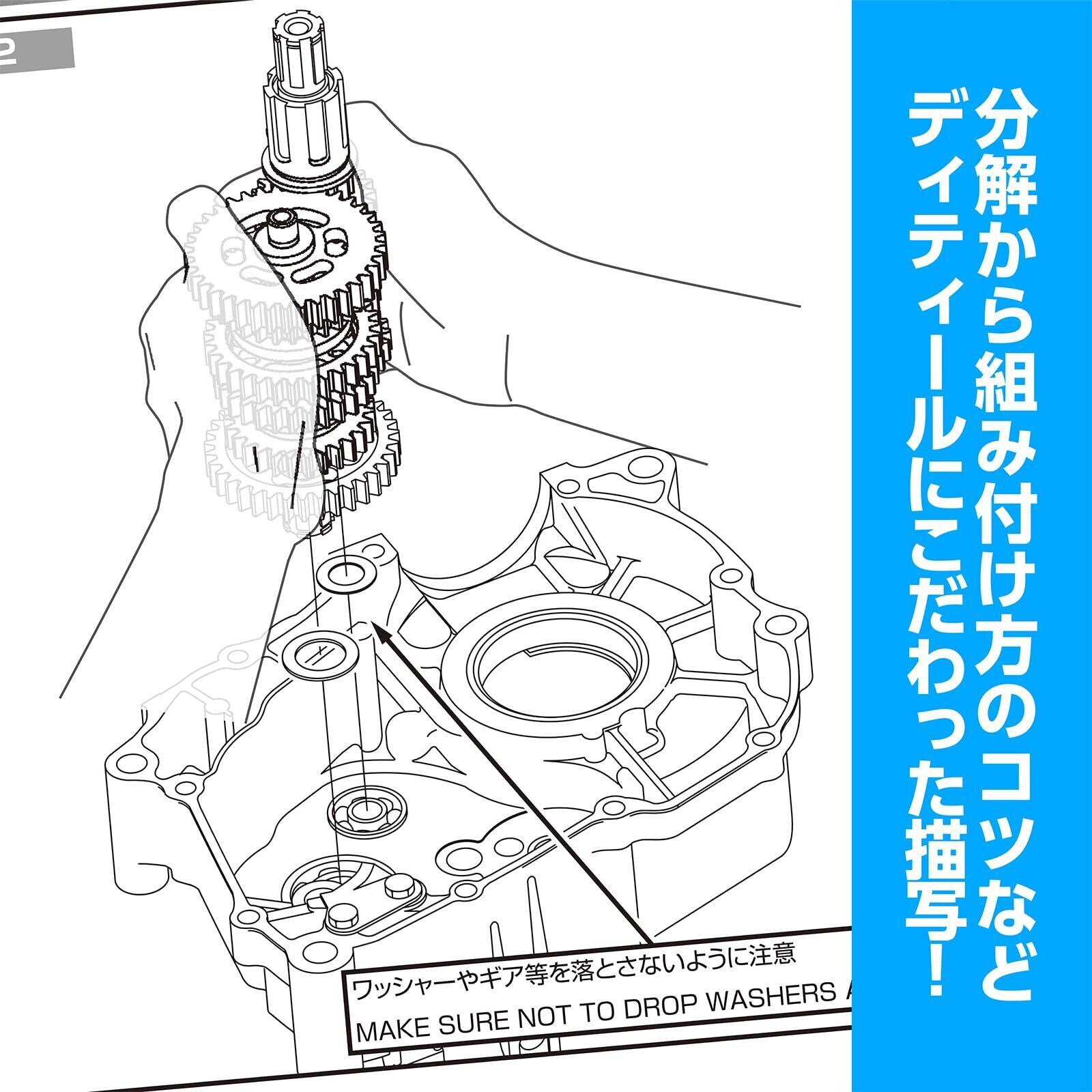 腰下編はクランクシャフトからクラッチ、オイルポンプ、ミッションに至るまで詳しく脱着手順を掲載しています。オールイラスト図解だからプラモデル感覚でエンジン構造の勉強ができます。