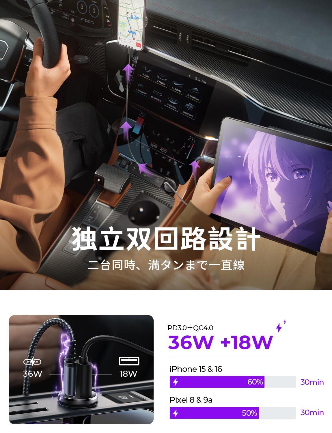 【超急速充電 シガーソケット】デュアルPD3.0(36W)+QC3.0(18W)ポート搭載。iPhone/Samsung/Android/iPadなど対応機器をわずか30分で0→60%充電。通勤・旅行時のナビ操作や音楽再生中でも、切れる心配のない電力供給を。日常通勤から長距離ドライブまで必須アイテム (※ご注意:2台同時54Wの急速充電不可)
