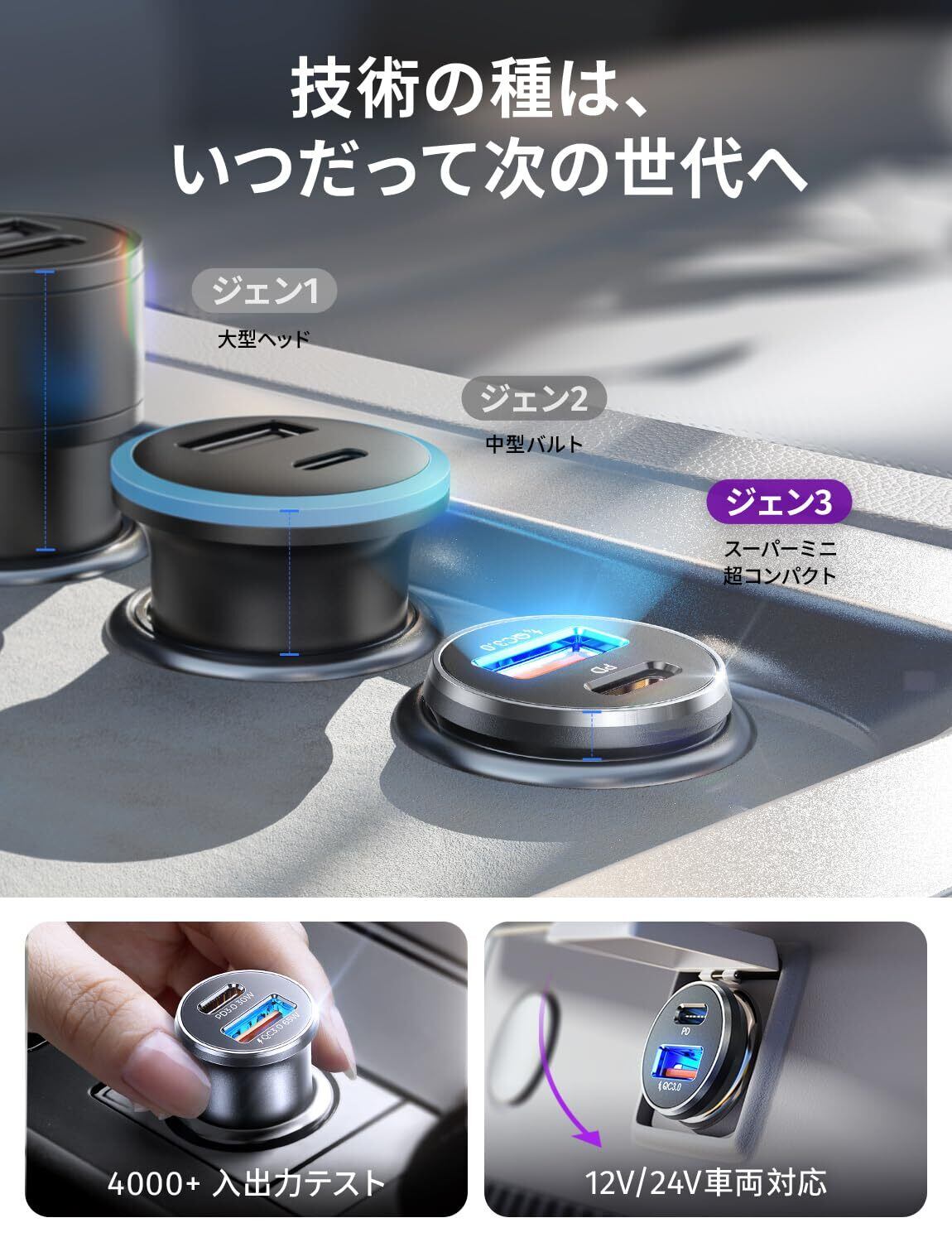 【全アルミ冷却設計・過熱防止】プラスチック製品より安全なアルミ筐体。UL/CE/FCC/RoHS認証取得のインテリジェント電源管理チップを内蔵。低温動作・難燃性・環境配慮設計で、長時間使用でも熱暴走なし。複数安全システムが端末を保護。12V/24V車両全対応(トラック・RV含む)軽自動車(K-Car)シガーソケットにも対応