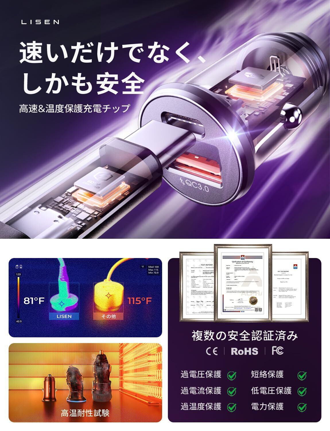 【特価セール】LISEN 【54W+60W 最速タッグ】 シガーソケット USB-C & USB 車 充電器 PD3.0/QC3.0/PPS対応 しがーソケット usb cタイプ 車載充電器 コンパクト/過電流/過電圧/短絡保護 カーチャージャー タイプc iPhone 14 15 16 Pixel 8 9a Aquos Wish4 Sense9 スイッチ2 iPad AirPods 対応 12/24V両用