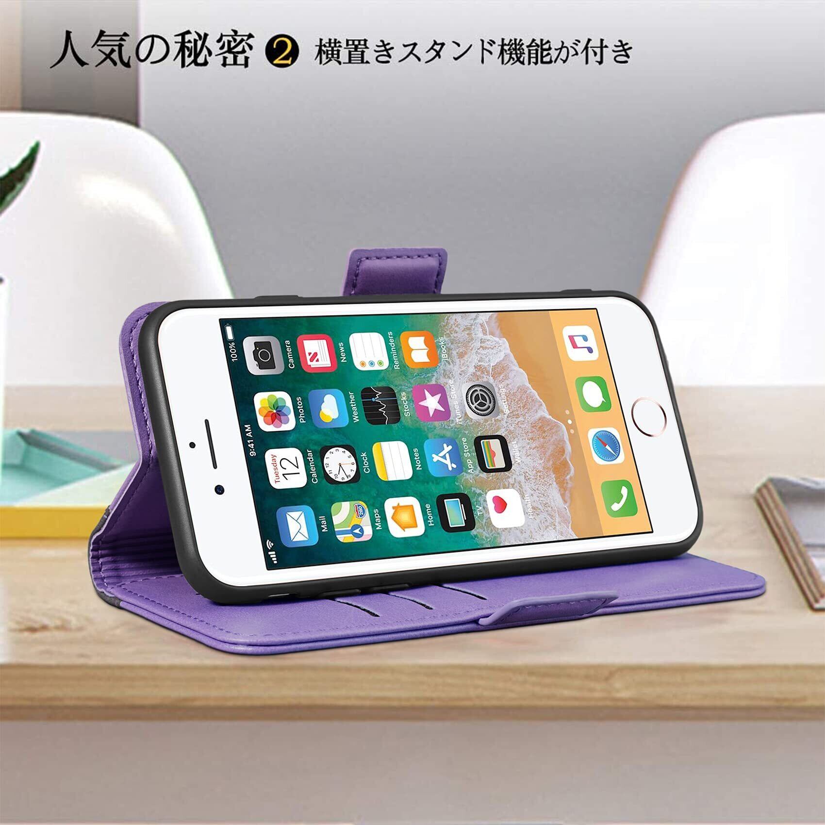 機能性 横置きスタンド機能が付いて、好きな角度で動画鑑賞や読書などを楽しめます。ブック型ケースとして、内側には三つのカード入れとフリーポケットがつき、名刺や定期券の収納に優れているiPhone se 第3世代 手帳型ケースです。