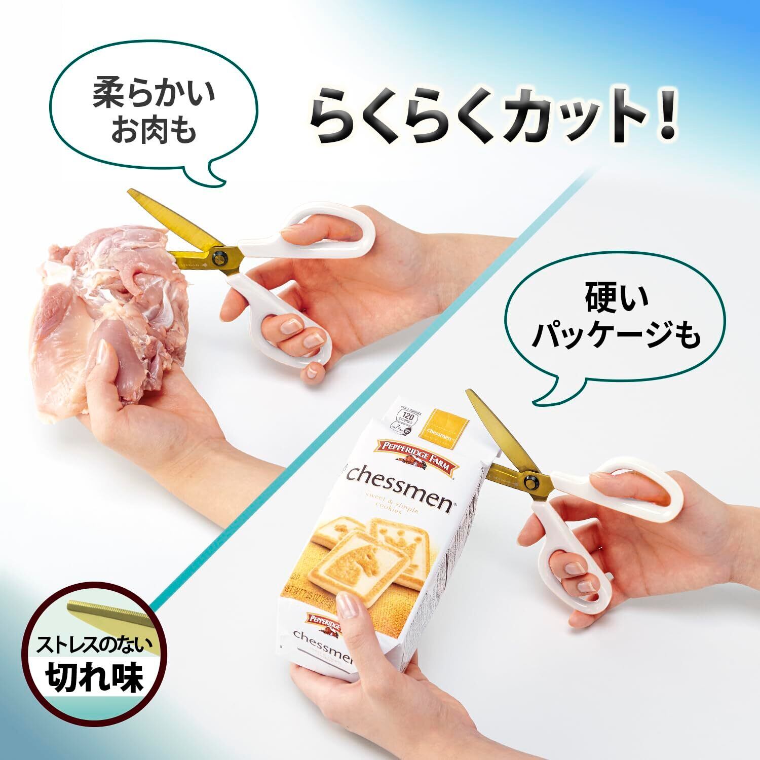 パッケージや肉・タコ・生のワカメなどの食材も切りやすく、幅広い用途でご使用いただけます