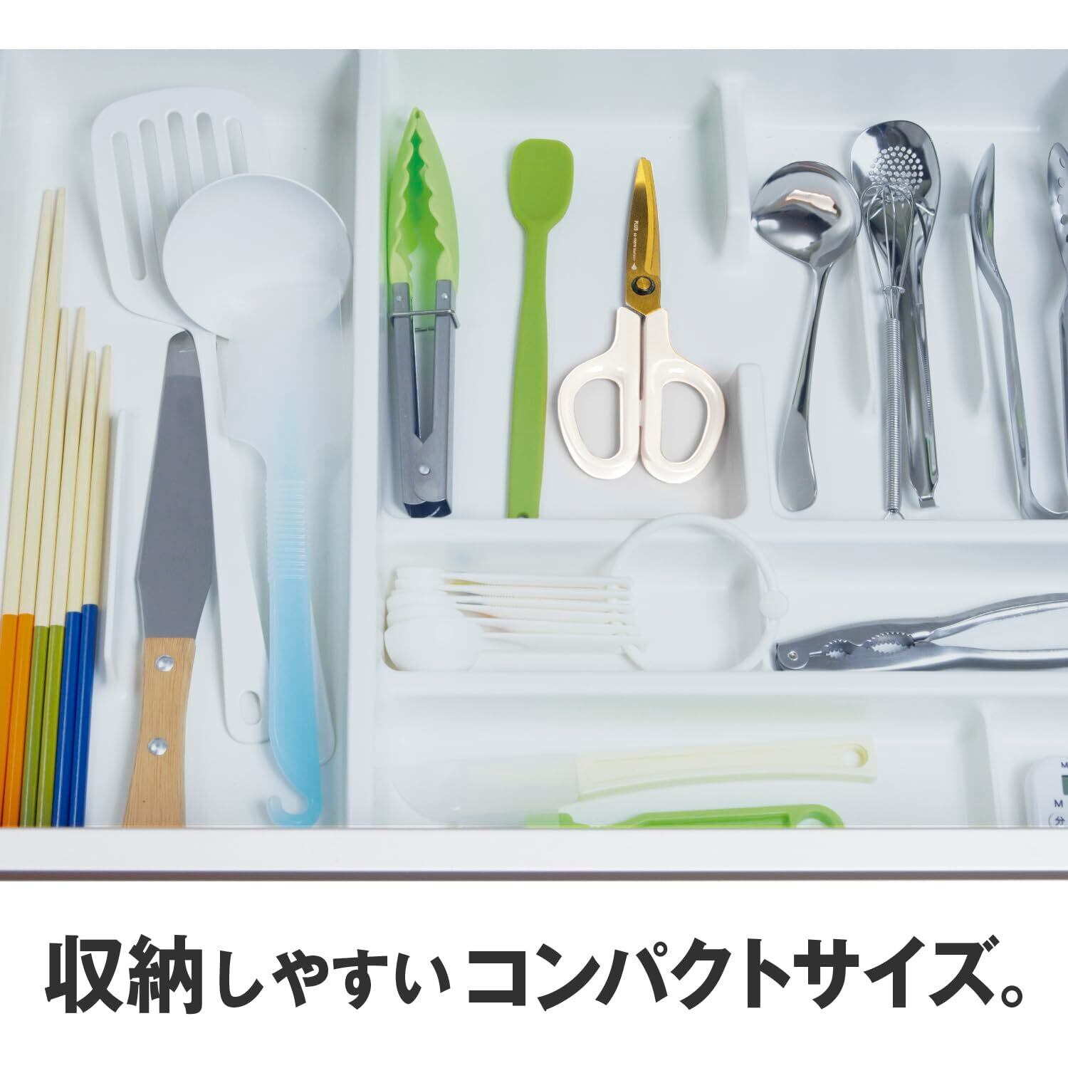一般的なキッチンばさみと比較して小型かつ軽量設計、キッチンの引き出しにも入るコンパクトなサイズ